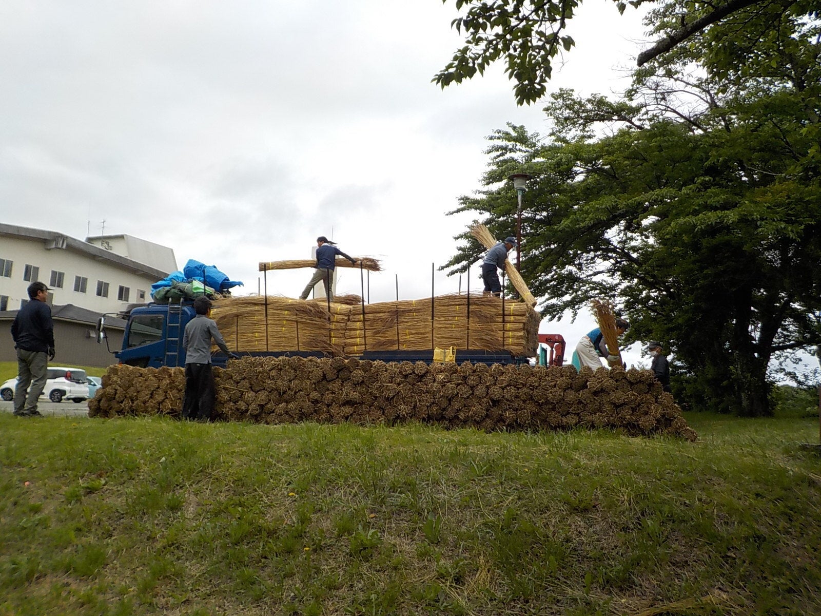 屋根の材料であるヨシ束が運び込まれました。