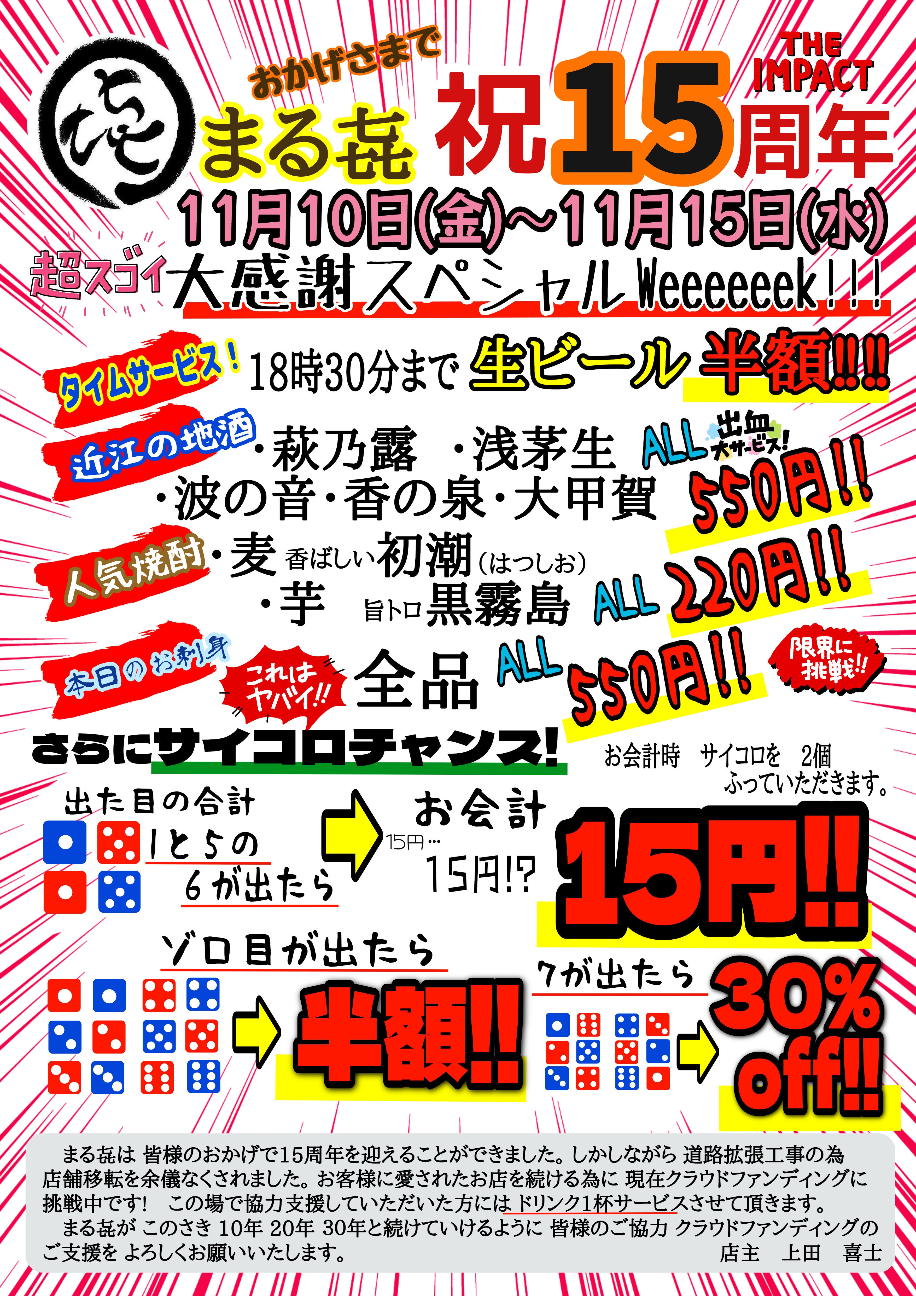 先日、ついに50%達成いたしました!本当に感謝しかありません。そして皆さんお気づきかもしれませんが....「100万円のご支援で一生飲み放題!」のリターンに支援者が現れました!!なんとありがたいことでしょうか(T_T)私たちのお店に100万も出していただけるなんて、こんな心意気のある方にはこちらも一生懸命お応えするしかありません!!まずはしっかり資金を集めて新たなお店を無事オープンさせることが最初の恩返しだと思っています。もちろん、金額に関係なくご支援や拡散にご協力いただいた全ての方に対しても同じ気持ちです。そしてまる㐂を支援したことを絶対後悔させませんので安心してお知り合いの方にもこのプロジェクトをおすすめしていただきたいです。さて、いよいよ11月に入りますが、15周年の激熱イベントはもうご存じですか?18時半まで生ビール半額近江の地酒、人気の焼酎、お造りまでもがかなりお得になります!そして一番の目玉は何と言ってもお会計でのサイコロチャンス!!!お会計がいくらだろうと出目が1と5なら15円にしちゃいますΣ(・ω・ノ)ノ!さらにゾロ目で半額!! 7で30%OFF!!お客様に心配されちゃうほどの内容です!(笑)いっぱい食べていっぱい飲んで15円当てて、支援までしていただけると最高に嬉しいです!まだ達成まで半分ありますのでぜひ拡散等していただけますよう、よろしくお願いします。