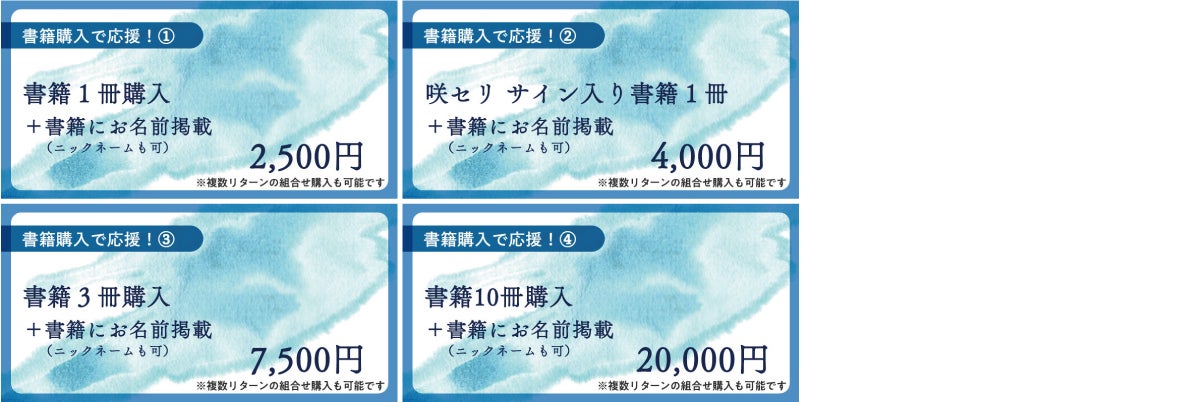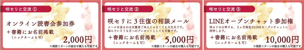 純粋に応援をしていただける方、ここに集う方と交流したい方、咲セリに相談をしたい方、書籍が欲しい方、書籍の世界を共有したい方などに向け、それぞれリターンを用意いたしました。