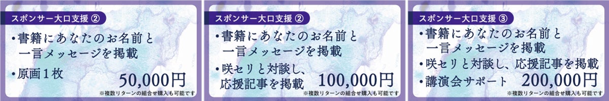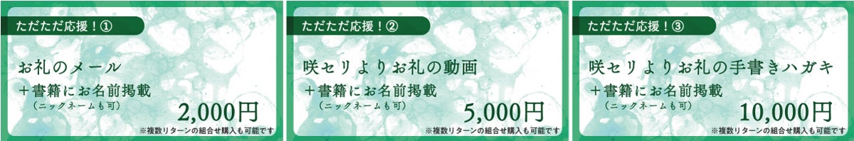 一言メッセージについては後日風鯨社とのやりとりになります。また、咲セリと対談し、応援記事を活動報告ページにて掲載させていただきます。さらに、金額の一部を書籍出版に関連した咲セリ講演会開催のサポート費用にまわさせていただき、講演会サポーターとしてもお名前を掲載させていただきます。…200,000円