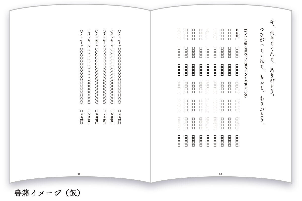 ◆巻末のお名前掲載に加え、本を手に取った方それぞれが直接手渡したい誰かや自分へ向けての言葉を書き込める白紙ページもあり、苦しい時に、巻末の名前やメッセージを見るだけでも、同じような気持ちを抱えているのは「自分だけじゃない。ひとりじゃない。」と知ってもらえる本を作ります。