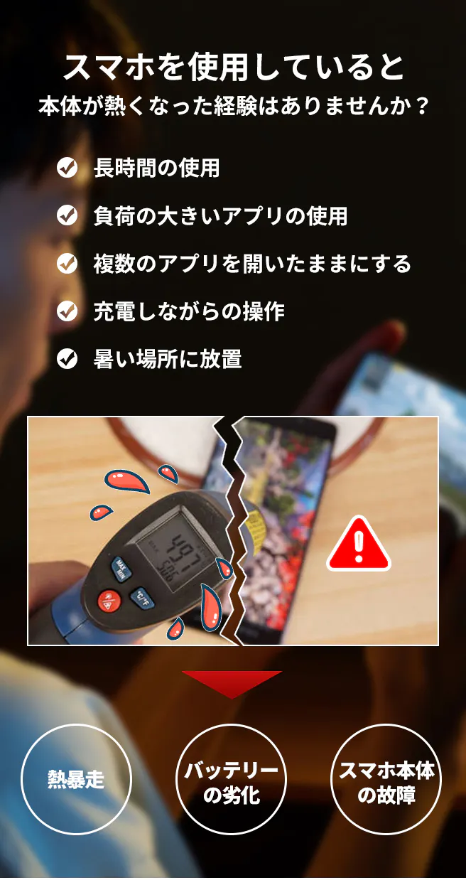 スマホを熱いまま使うとバッテリーに負荷がかかりバッテリーの消耗が早くなります。また熱暴走、スマホ本体の劣化・故障を引き起こす可能性があります。