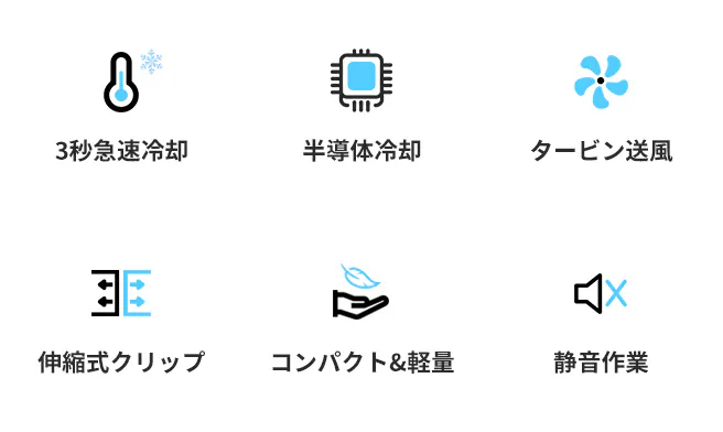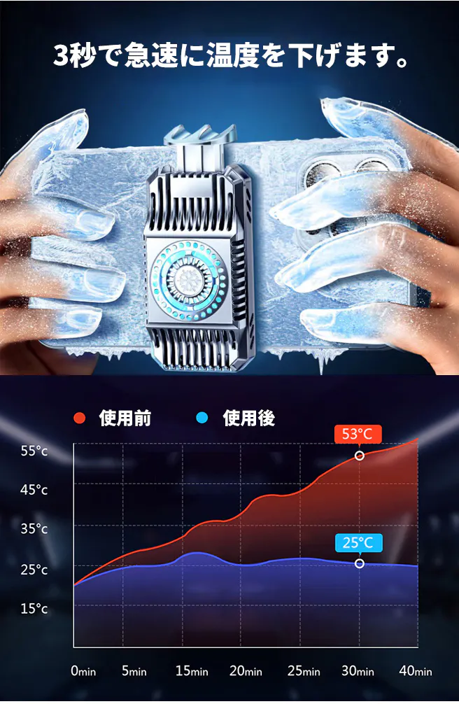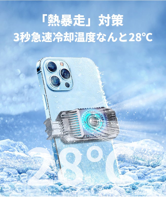 スマホ冷却クーラー「S01」は、半導体冷却方法を採用しており、約3秒で効率的の冷却効果を実現でき、発熱による急に画面が暗くなることを防いだり、バッテリーの寿命を延ばしたりする効果あります!大切なスマホを熱から守ります。