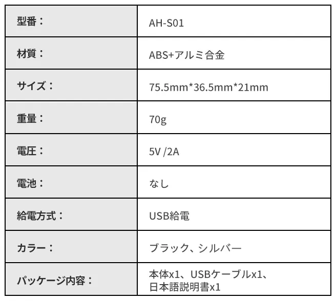バッテリー切れの心配がなく、連続使用しても問題ありません。*1.5m USBケーブル付属