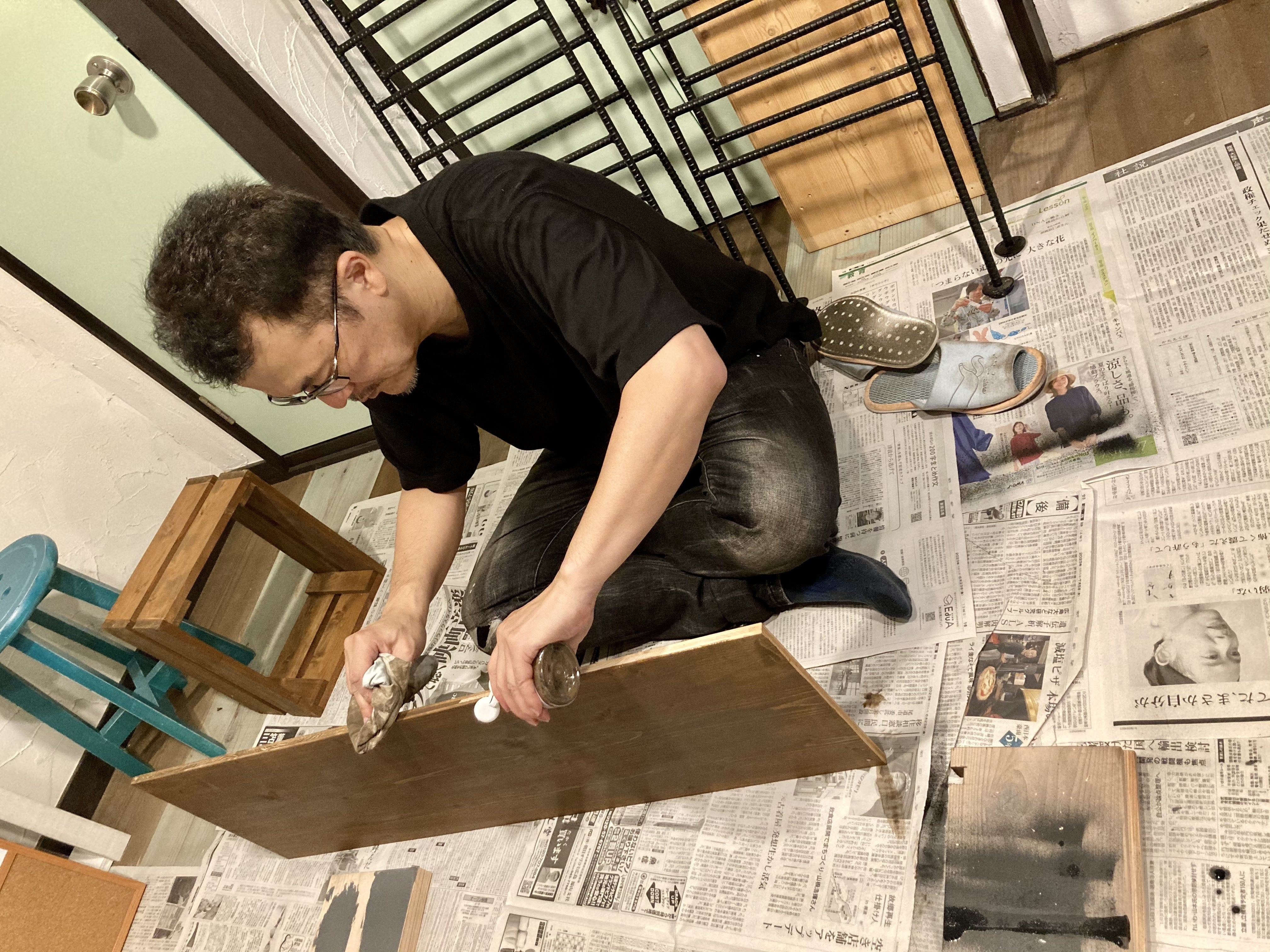 今日はトイレ前の仕切りに使う板とボードをペンキで塗りました。