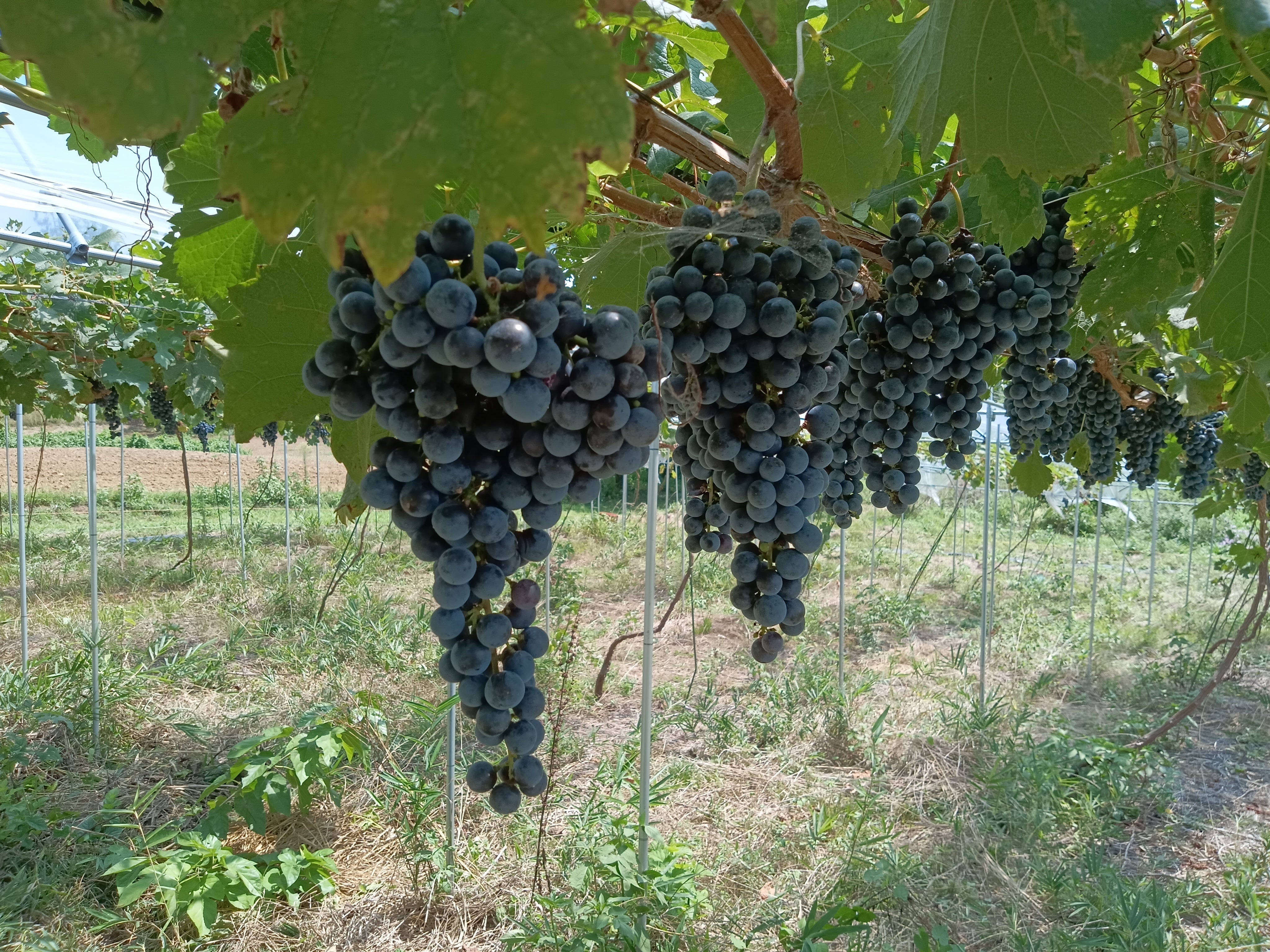 特に、最近拡張した畑は木の生育方向も揃え、斜面を上に上に伸ばしています。画像はメルローですが、古い圃場よりも着色の良い立派なブドウがぶら下がっています。栽培方法の改善により、栽培が困難と思われた品種まで出来ているという事です。