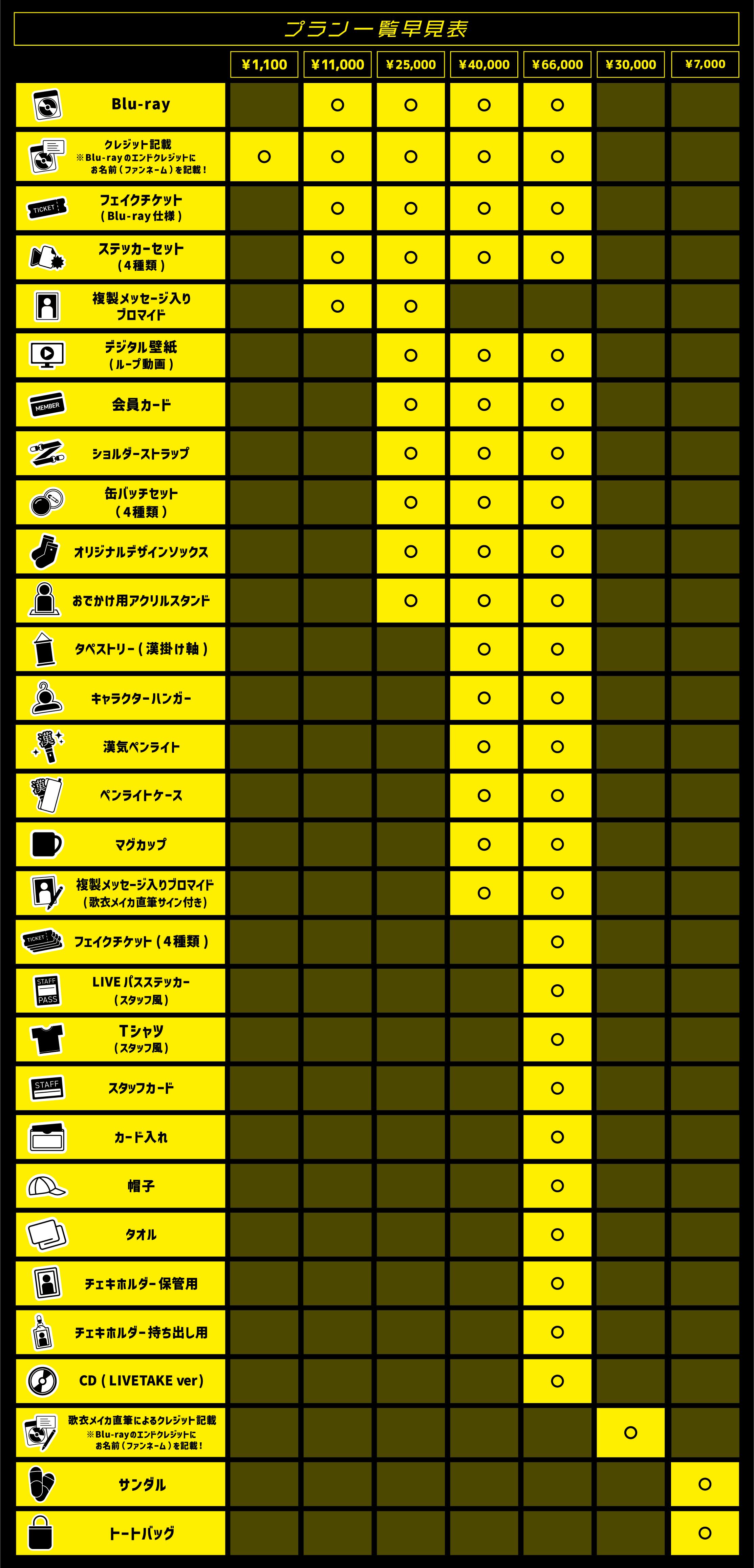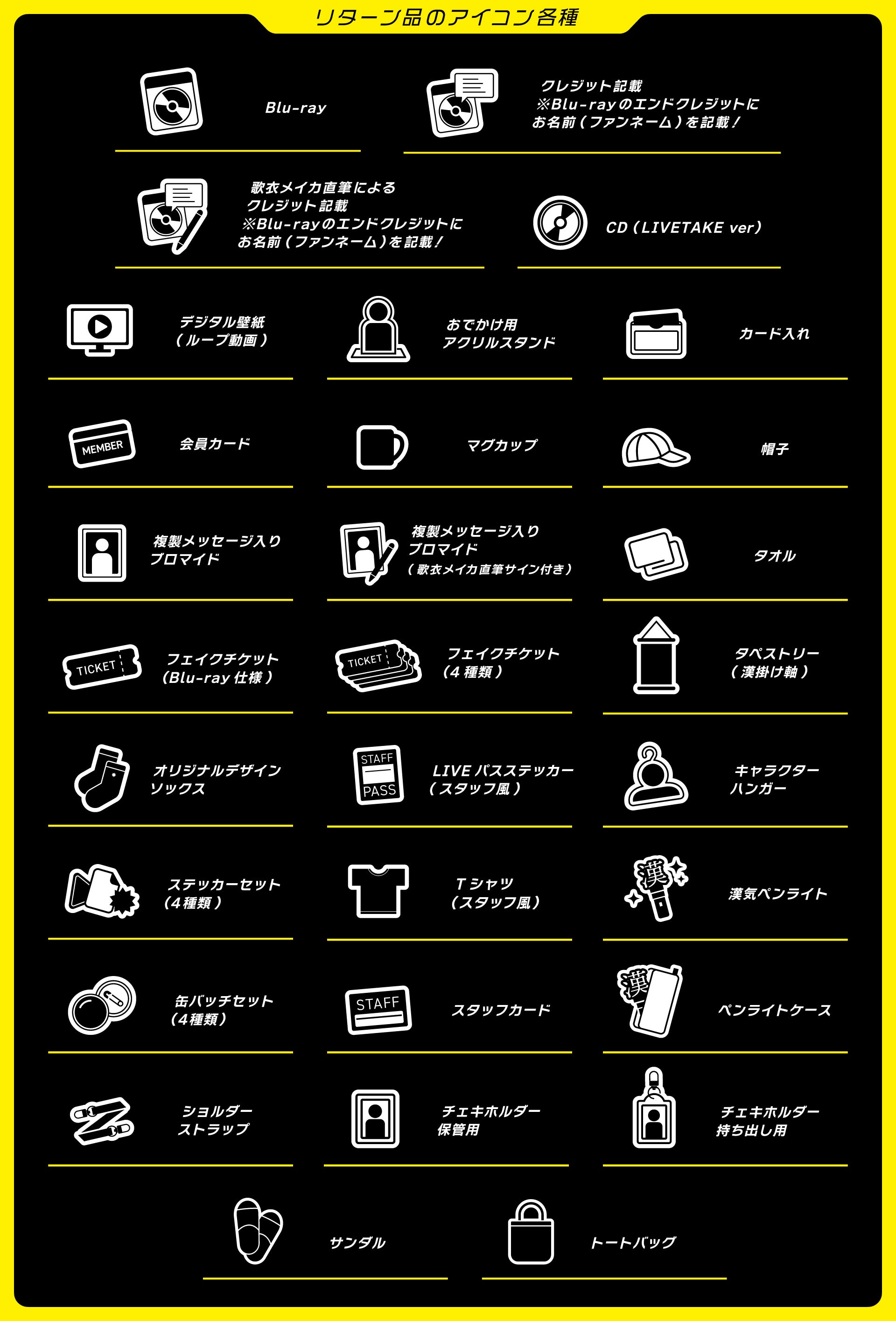 1.Blu-ray/2. フェイクチケット(Blu-ray仕様)/3. ステッカーセット4種類/4. 複製メッセージ入りブロマイド(歌衣メイカ直筆サイン追加!)/5. デジタル壁紙(ループ動画)/6. 会員カード/7. ショルダーストラップ/⒏オリジナル缶バッチ4個セット/⒐デザインソックス/10. お出かけ用アクリルスタンド/11. タペストリー(漢掛け軸)/12. キャラクターハンガー/13. 漢気ペンライト/14. ペンライトケース/15. マグカップ/16. フェイクチケット(4種類)/17. LIVEパスステッカー(スタッフ風)/18. ライブTシャツ(スタッフ風)/19. スタッフカード/20. カード入れ/21. 帽子/22. タオル/23. チェキホルダー(保管用)/24. チェキホルダー(持ち出し用)/25. CD(Live Take .ver)
