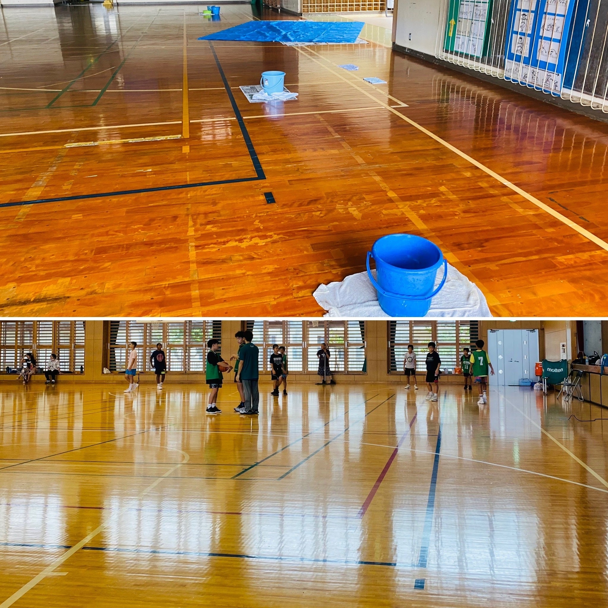 体育館中央の窪んでいた所に水が溜まり、床が浮き上がってしまっていました!これでは大会前の大事な練習ができません。近所の宜野湾市立体育館も雨漏りで使用不可とのこと!