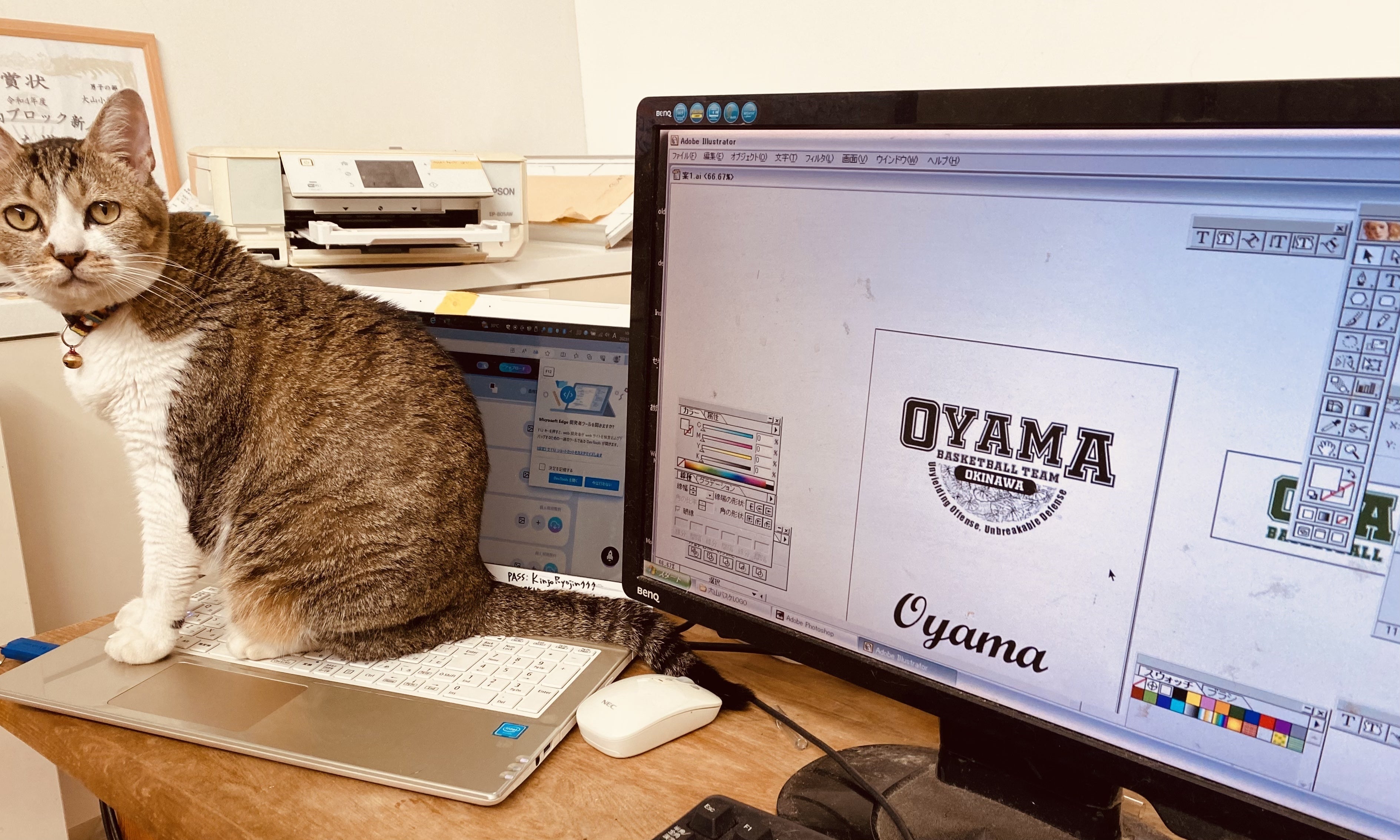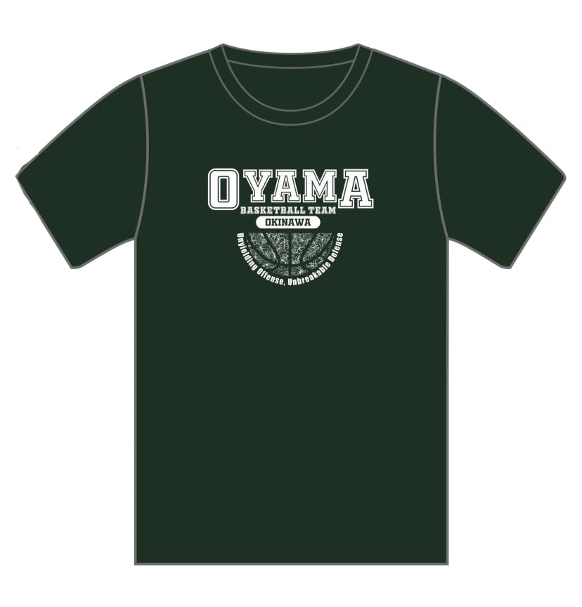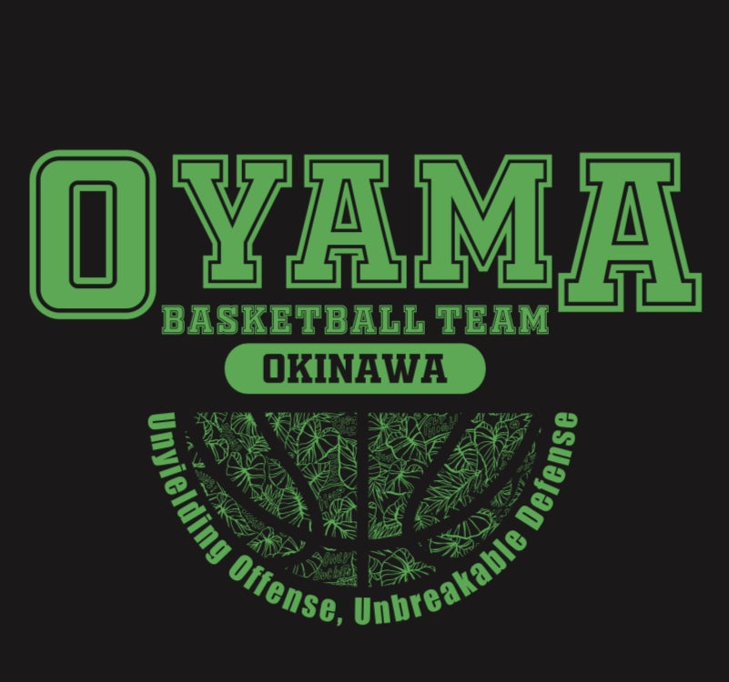 カレッジ風のOYAMAの文字に縁取りを付けて、ロゴの下にはバスケットボールをあしらいました。