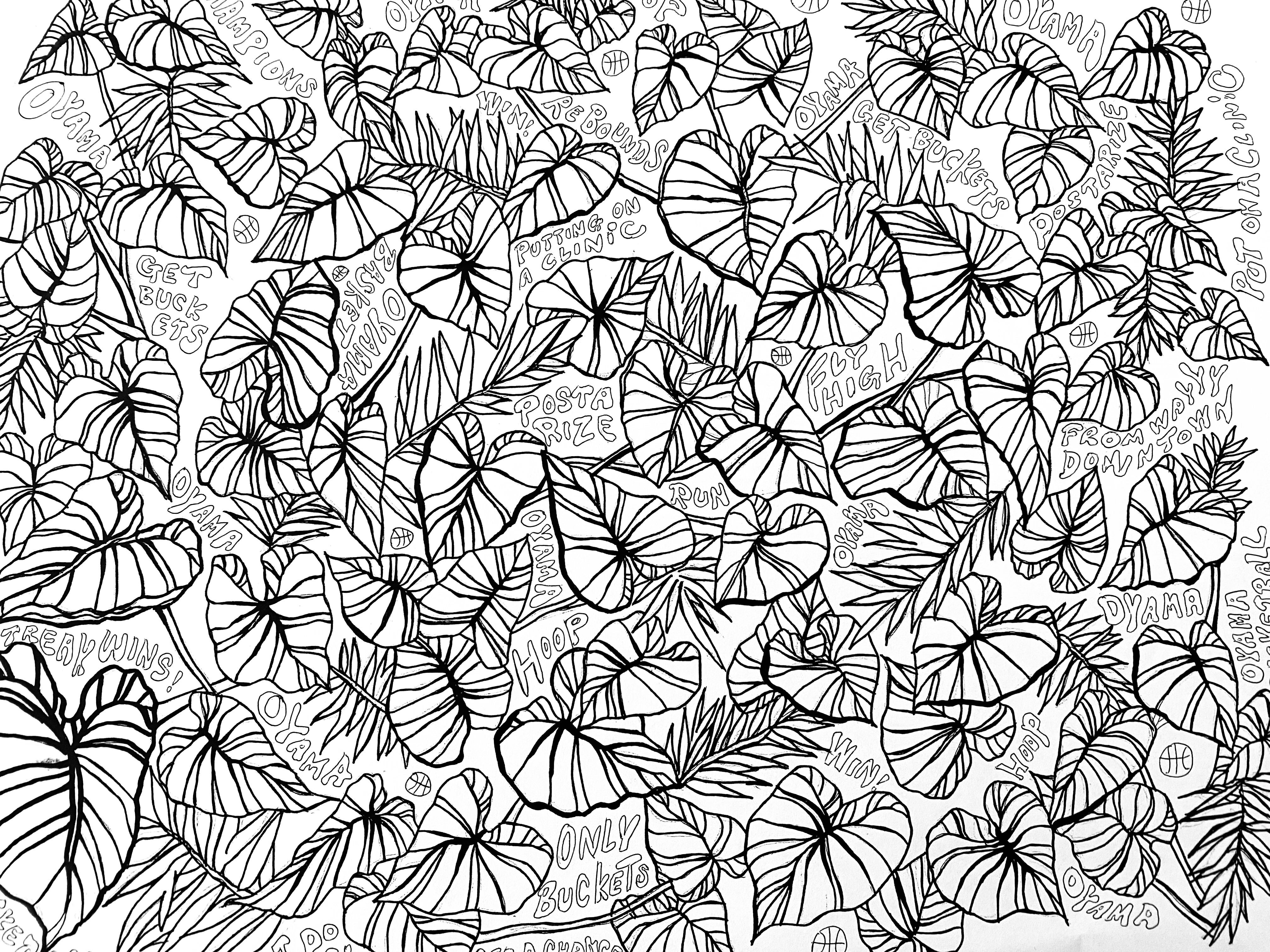 ボールの中をよく見ると…なんとターンムの葉っぱのデザインなのです。葉っぱの一つ一つを手描きして、葉っぱの隙間にはバスケ用語を隠し文字で散りばめてみました。