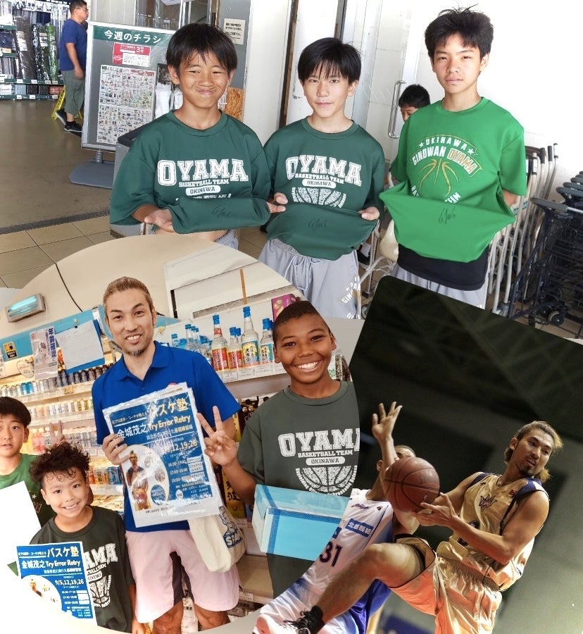 大山小バスケ部は資金造成のために沖縄県中部地区のスーパーや大型施設で街頭募金をさせて頂いています。これまで見ず知らずの方々からもたくさんのお声掛けとご支援を頂きました!チームTシャツはバスケ部のいわゆる正装です。ビシッと並んで大きな声でまずおはようございますの元気な挨拶をします。昨日はなんと、元琉球ゴールデンキングスのレジェンド金城茂之氏と偶然会えた子どもたち!!画面で応援していた憧れのプレーヤーに興奮して、写真を撮ってもらったりチームTシャツにサインを書いてもらったりしていました。レジェンドからはご寄付もして頂いた上、インスタに『大山小、九州大会頑張って!』のメッセージまで載せて頂きました!!写真/琉球ゴールデンキングス一方、さくもと牧港店に行ったメンバーは、ストリートパフォーマーのJJ氏のイベントに出くわしました!募金活動もしばし忘れてJJ氏のボールさばきに夢中になる子どもたちでした。ボール同時回転のギネス記録を持つJJ氏と大山小バスケ部員のコラボ動画はこちらから↓なんとイベント後にJJ氏からも募金のご協力がありました!マイクパフォーマンスで大山小の紹介もありがとうございました。JJボールを回す人 YouTubeはこちら練習試合や大会で対戦した小学校の父母の皆さまやコーチ、OB・OGの方々も街頭募金の施設にお立ち寄りの際にご寄付をして下さり、この場を借りて心からのお礼を申し上げます。