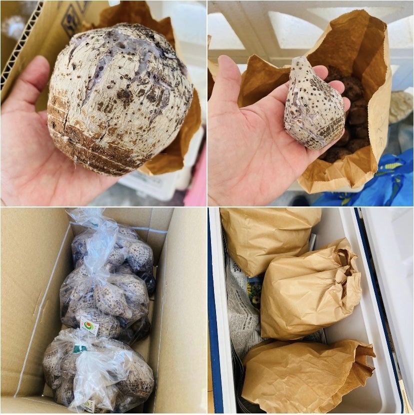 『大山産ターンム(田芋)』、サイズ(大または小)、重量(1kg)、保存方法(冷凍で2ヶ月)、賞味期限(解凍後3日以内)