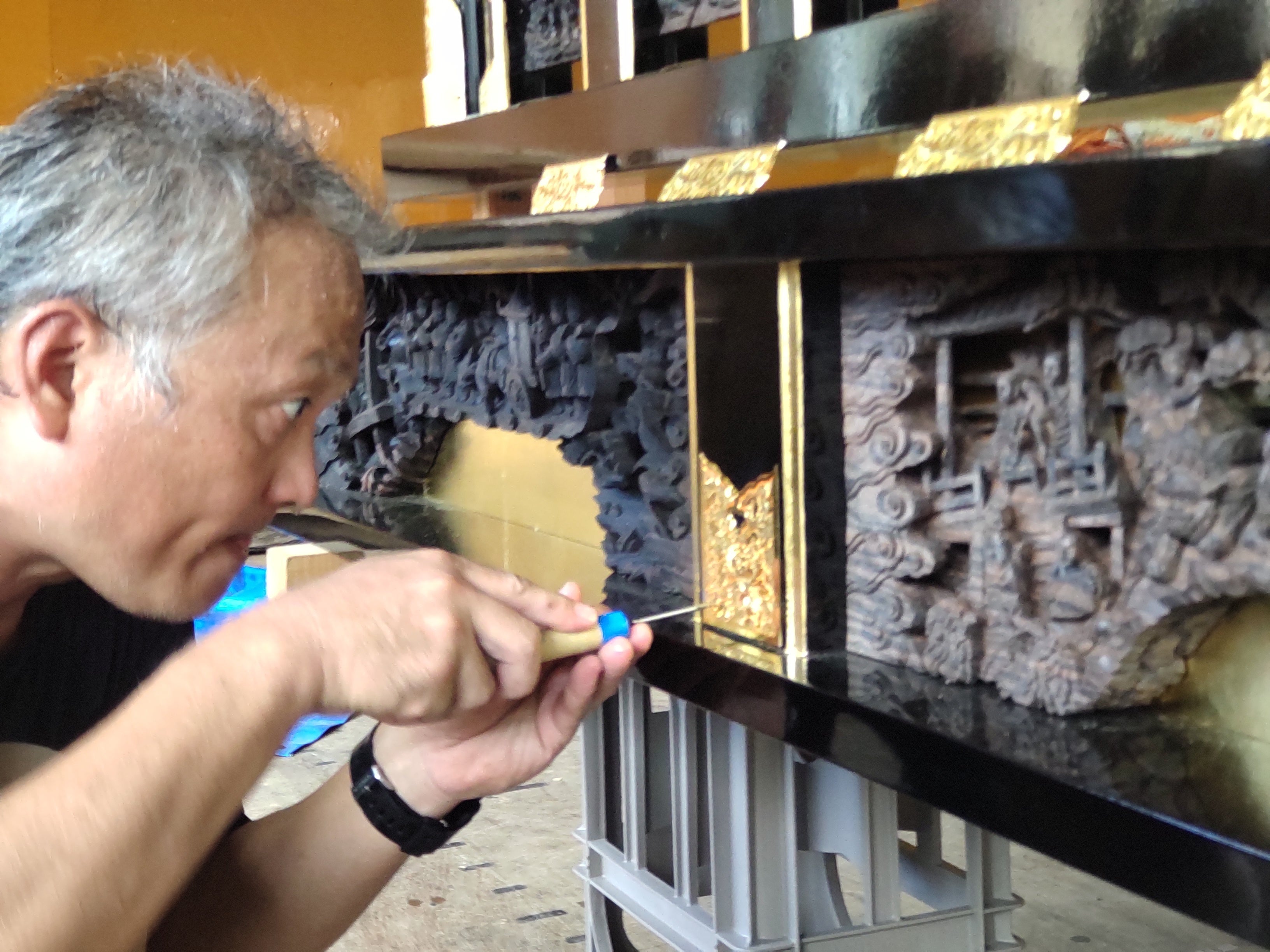 輪島塗に木彫の細かい細工や、金箔、金物の細工など能登の職人技を集めた最高級なキリコに仕上がった様子。