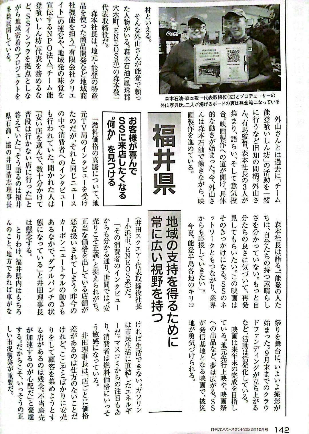 穴水町で経営しているガソリンスタンド「森本石油」が特集記事になり、