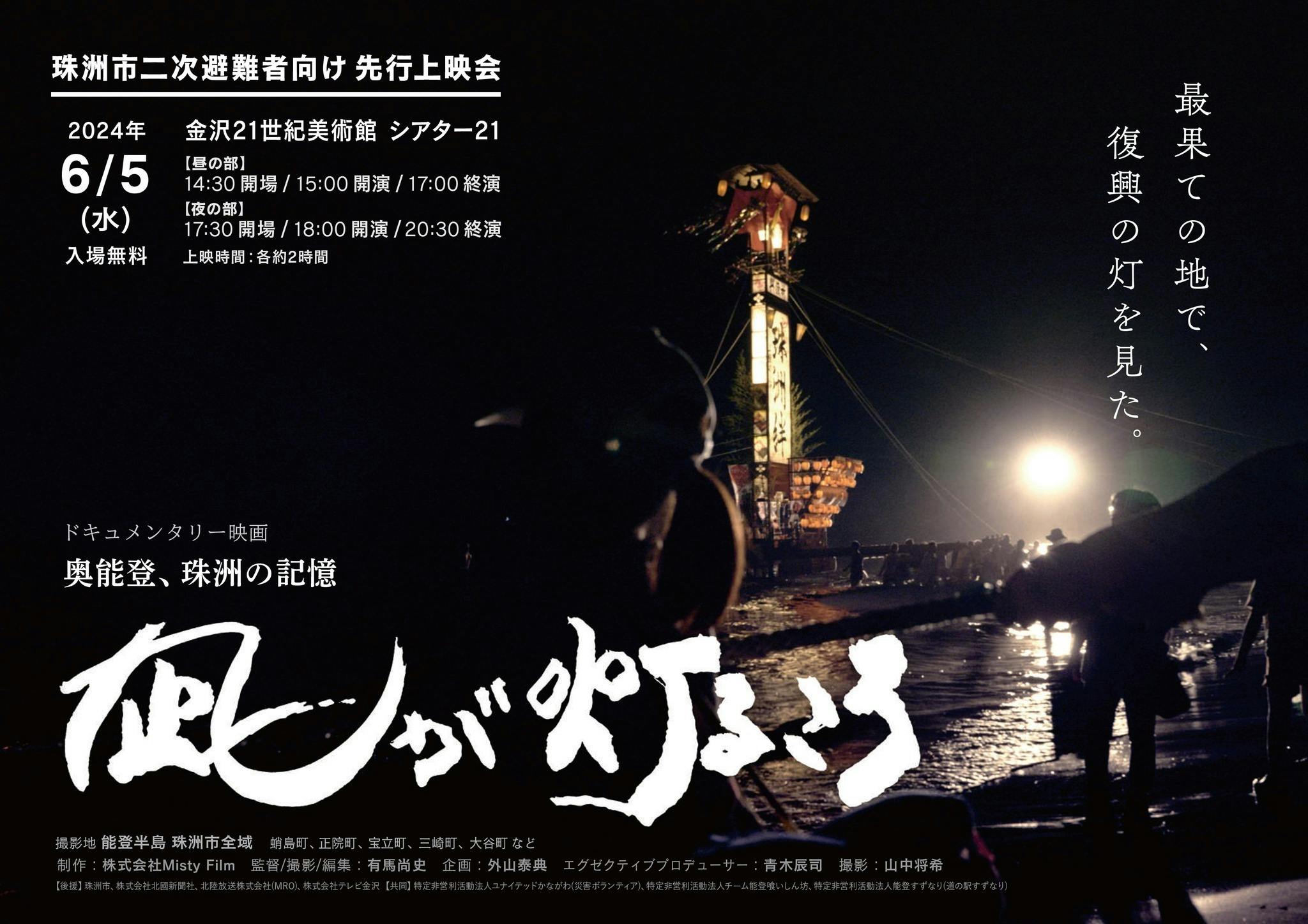 前置きが長くなりましたが、令和6年能登半島地震を経験し本来の映画のコンセプトが従来のものではなくなってしまいました。映画の公開時期も映画祭への出品よりも、公開を急ごう、早く珠洲の方に映画を見てもらいたいという有馬監督の思いを優先し、6月5日に金沢21世紀美術館で先行上映会を行うことになりました。