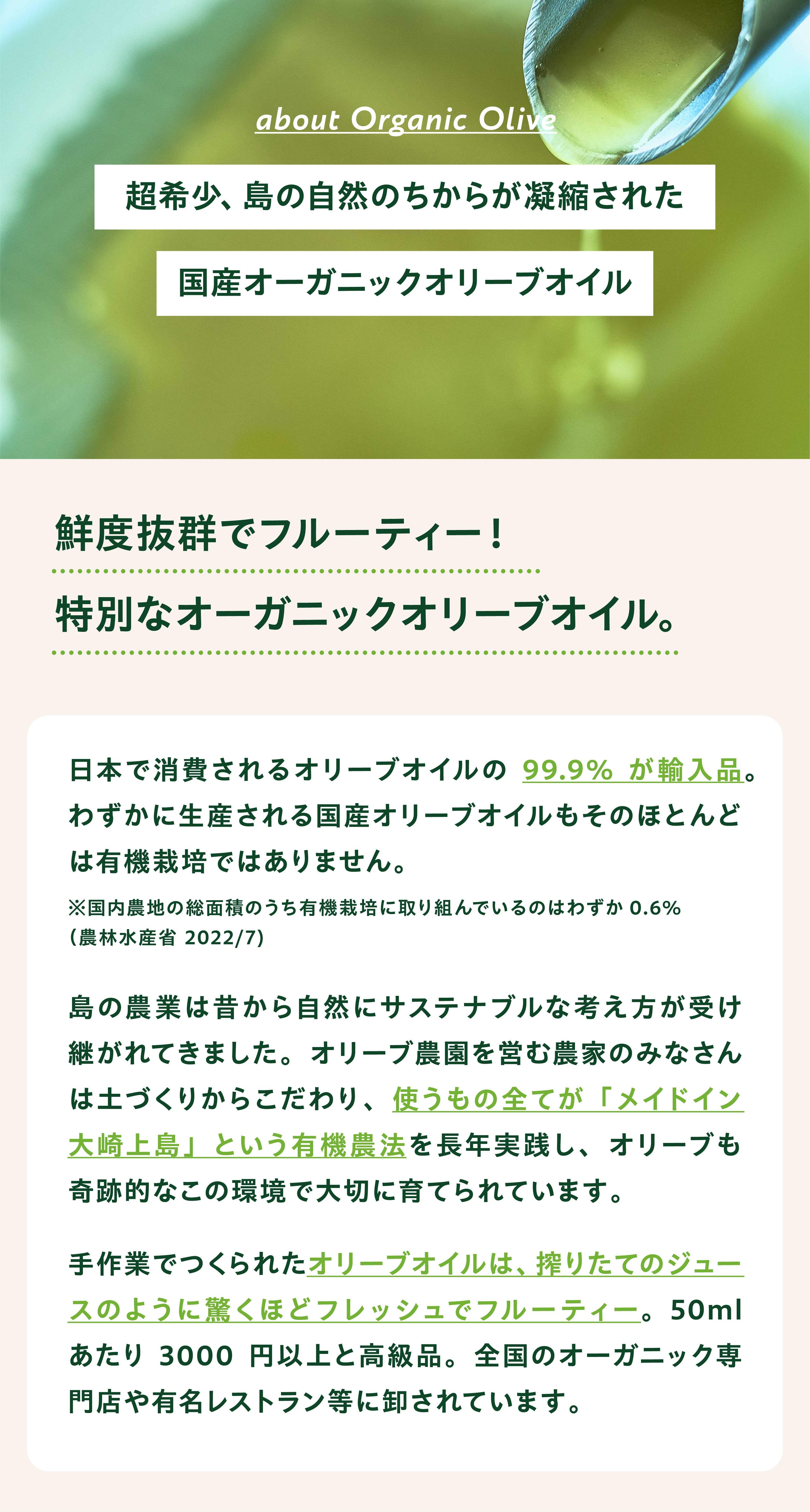 島で⼤切に育てている超希少なオーガニックオリーブのちからに着⽬。