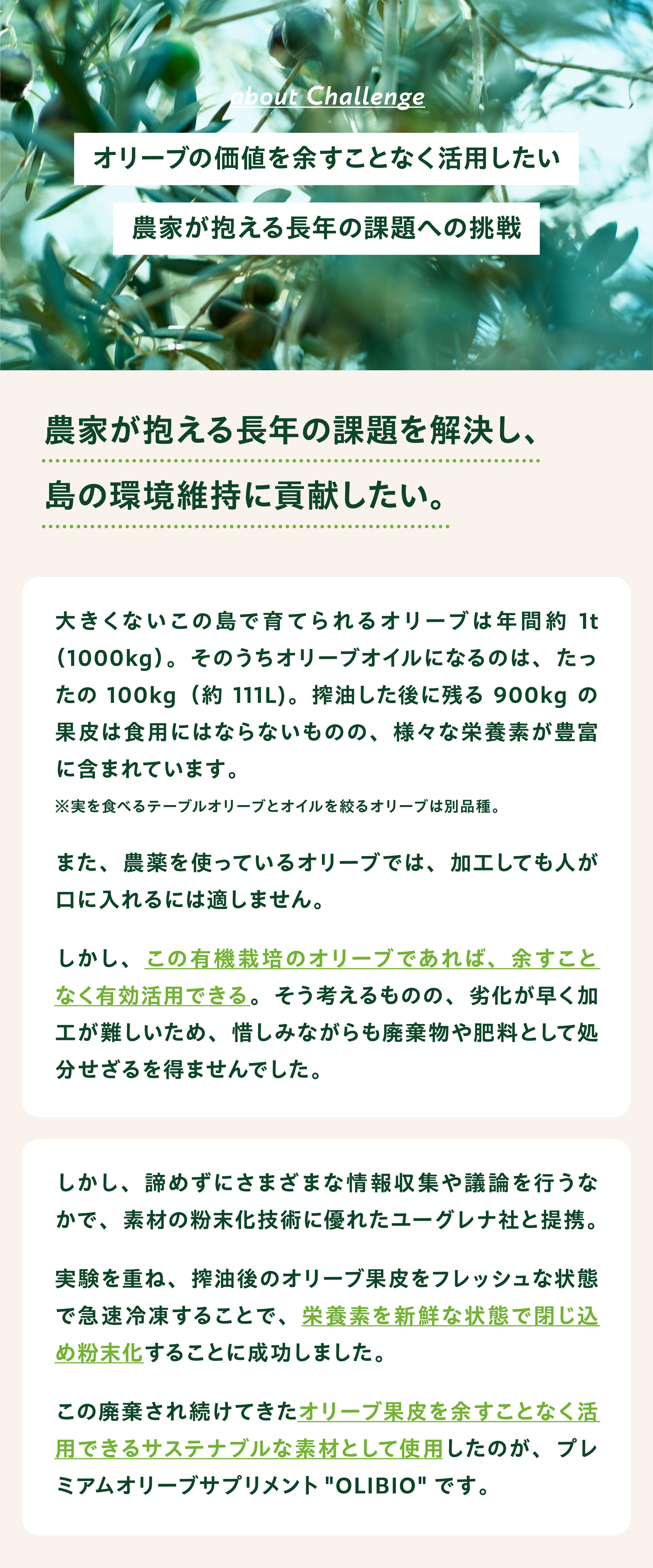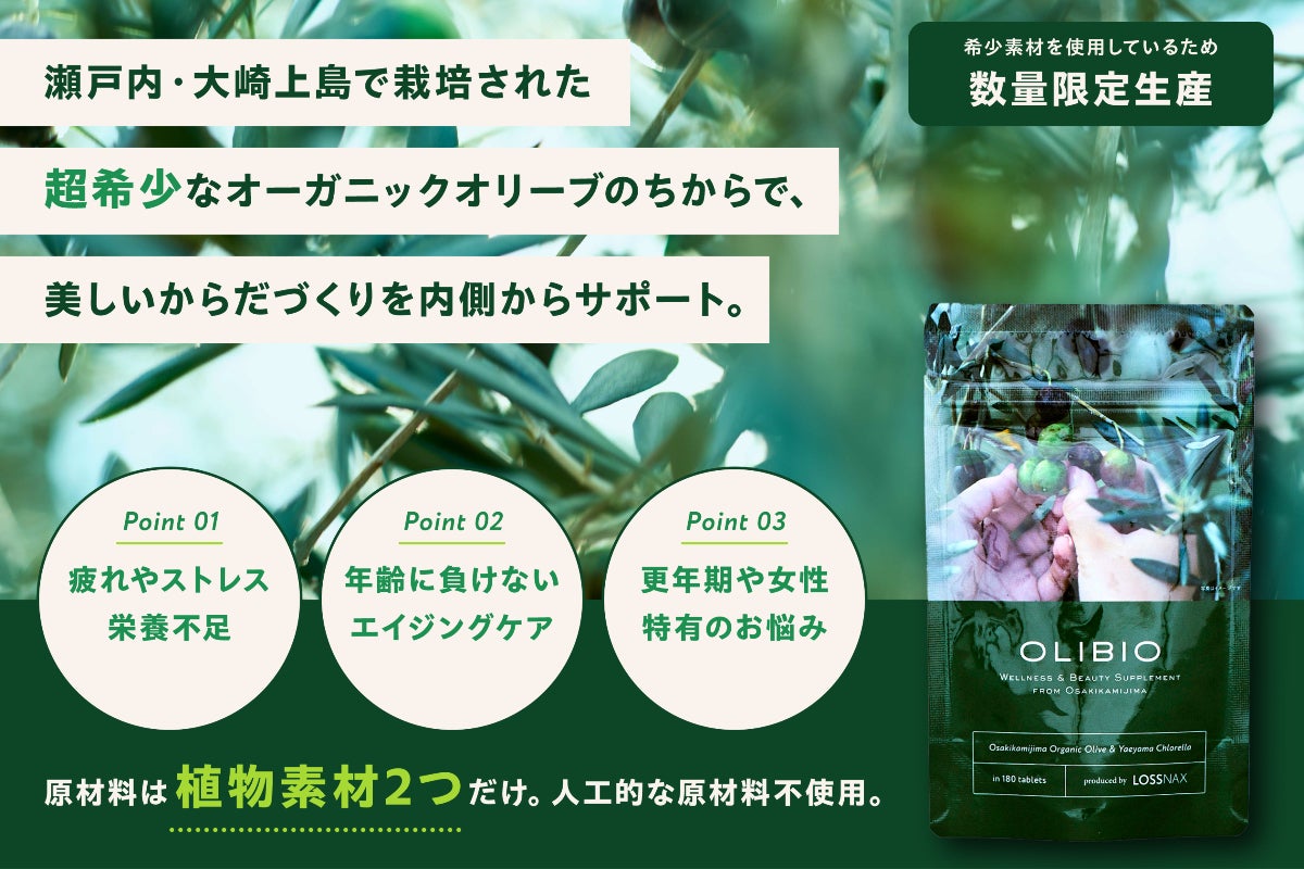 『私を含む島の農家が大切に育てている超希少なオーガニックオリーブを、余すことなく全国の方に取り入れてほしい』この想いで挑戦に取組み、われわれが行うフードロス対策事業“LOSSNAX(ロスナックス)”の一つとして、プレミアムオリーブサプリメント“OLIBIO”を立ち上げました。
