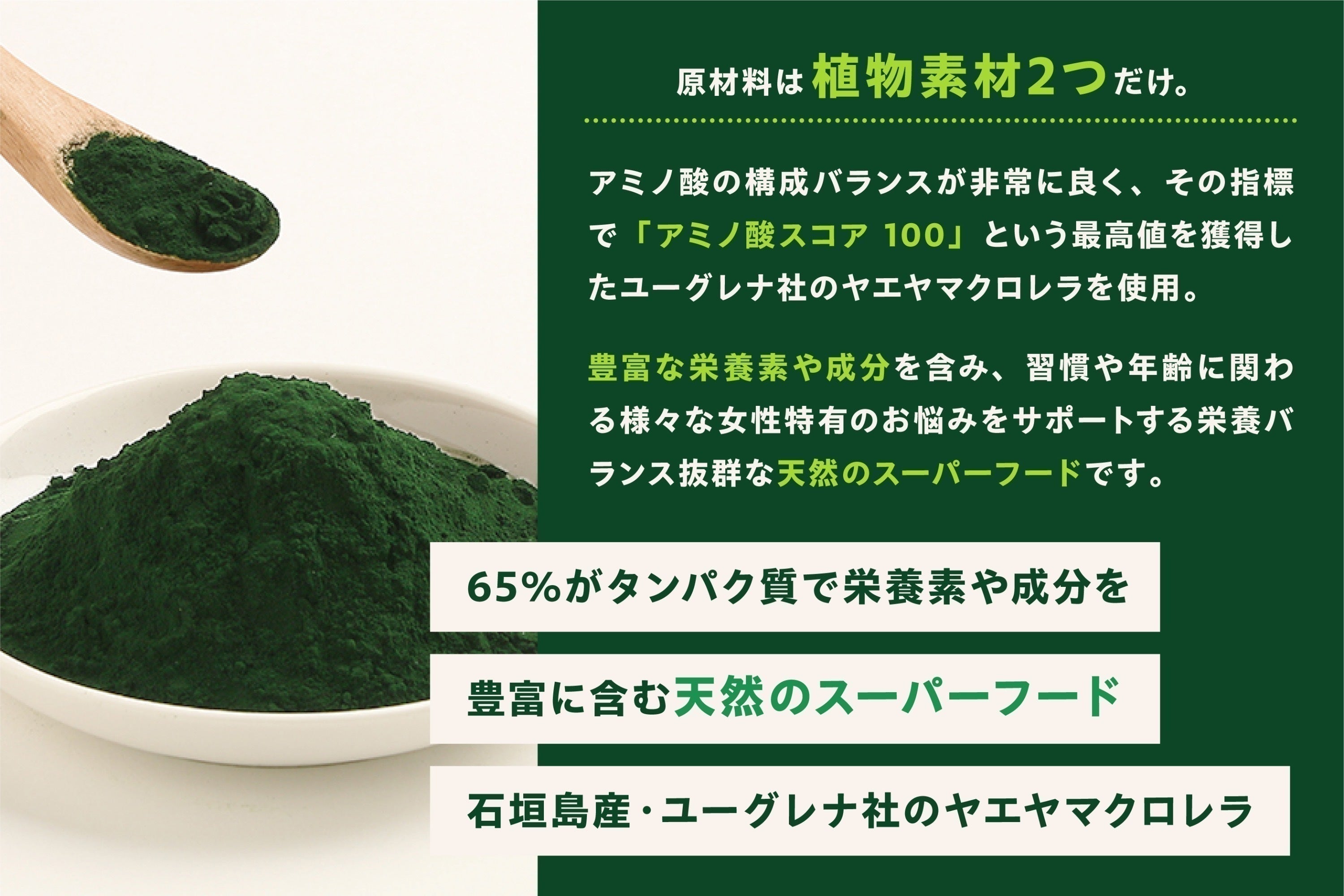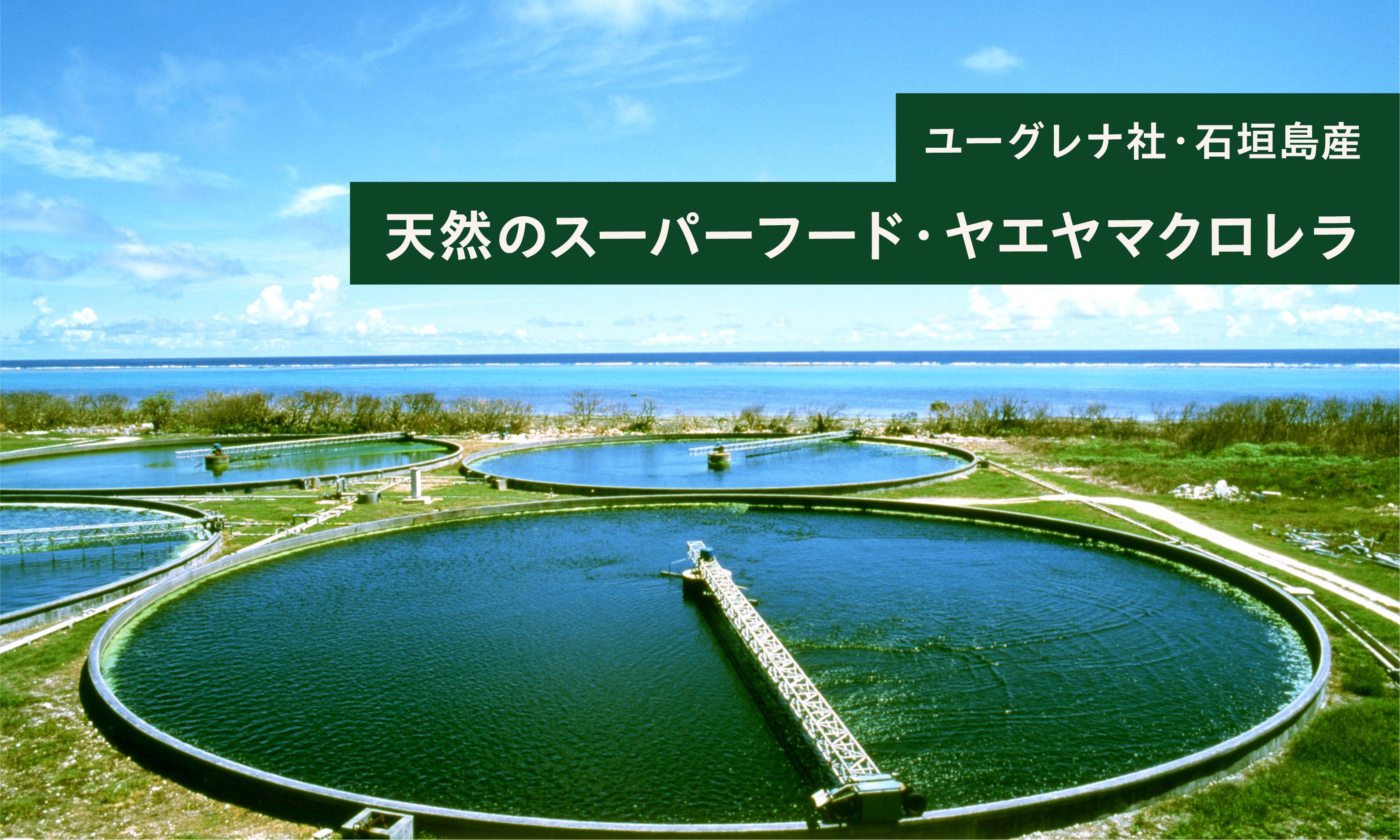 石垣島の光り輝く日差しを受けて育てられ、世界で初めて 「ASC-MSC海藻認証※」を取得したユーグレナ社のヤエヤマクロレラ。アミノ酸の構成バランスが非常に良く、そのバランスの程度を示す指標では「スコア100」という最高値を持っています。