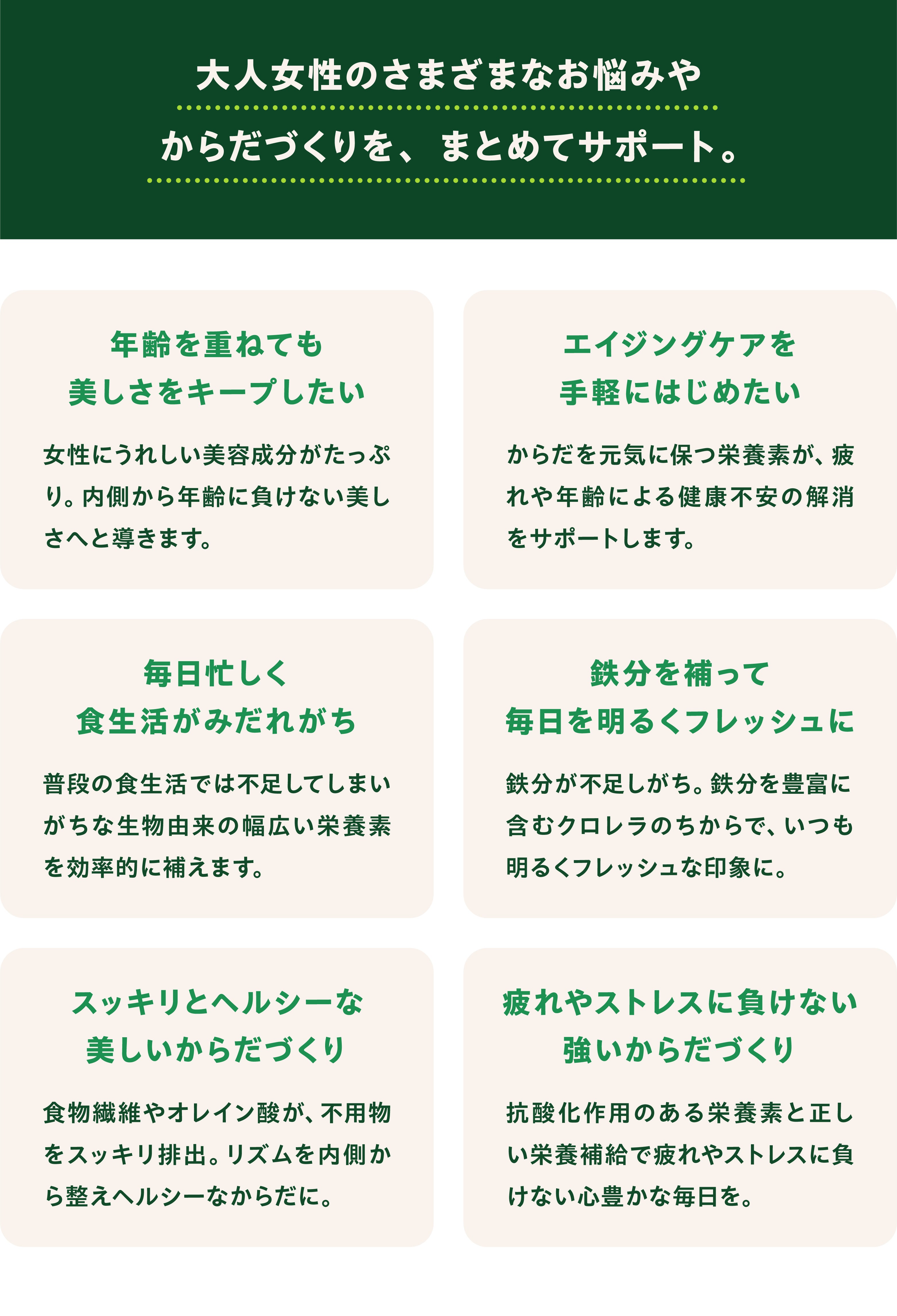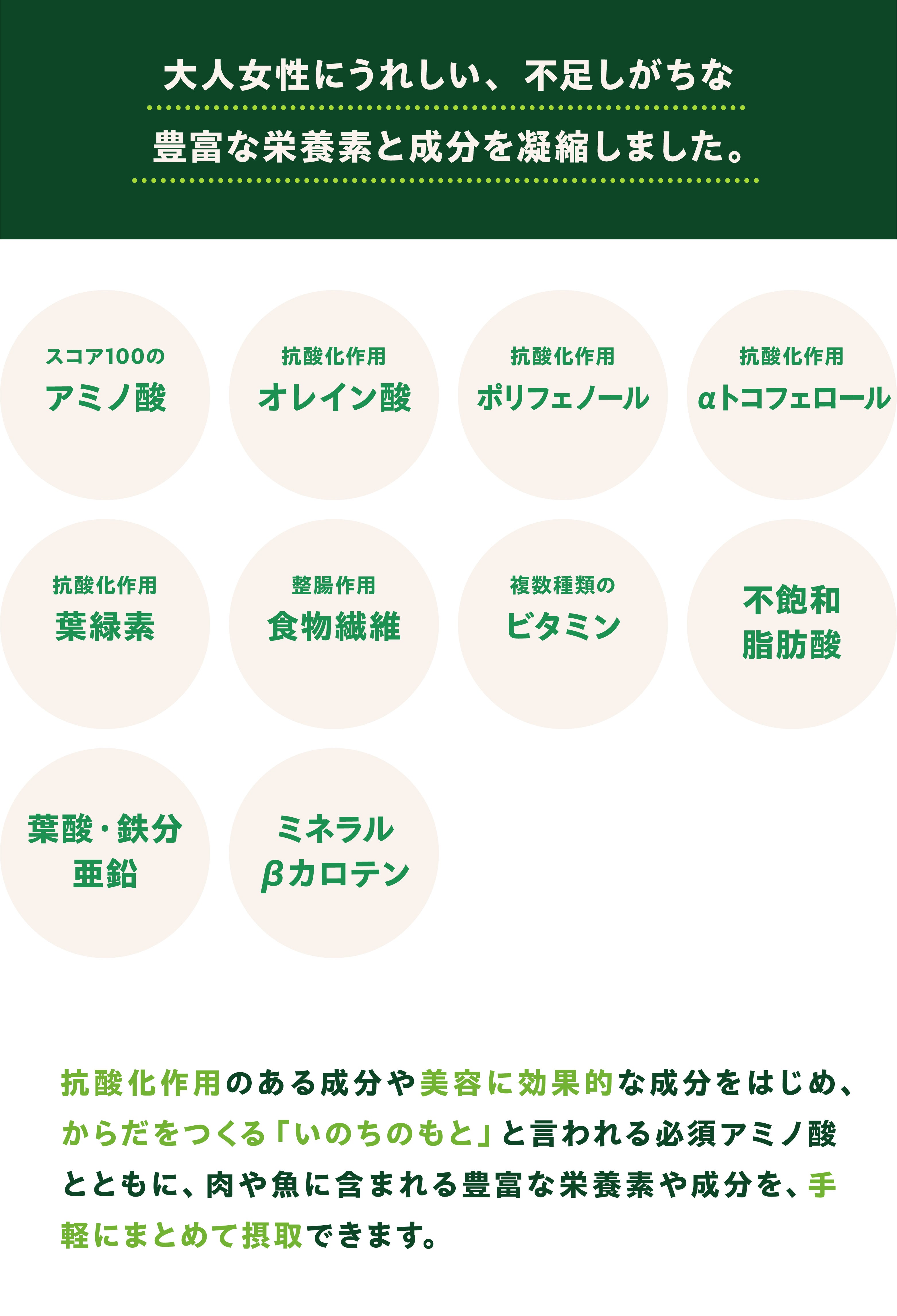 大人⼥性にうれしい豊富な健康と美容の成分が、年齢に負けないからだづくりをサポートし、ヘルシーな美しさをキープします。