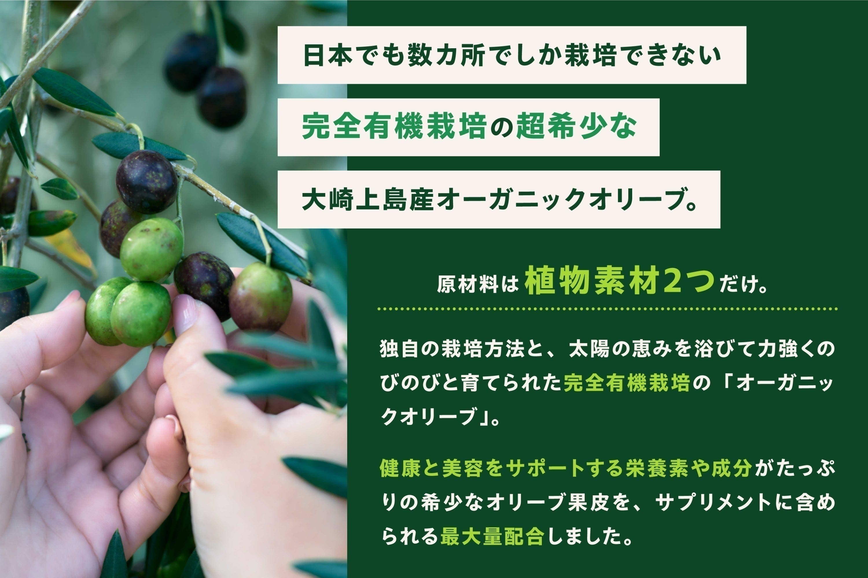 毎年限られた量しか収穫することができない完全有機栽培※のオリーブから、オリーブオイルを絞った後に残る果⽪を原料に、サプリメントに含められる最大量まで配合。⾷物繊維をはじめ、ビタミンやポリフェノール、オレイン酸などの栄養素・成分が、大人⼥性の美しいからだづくりを内側からサポートします。