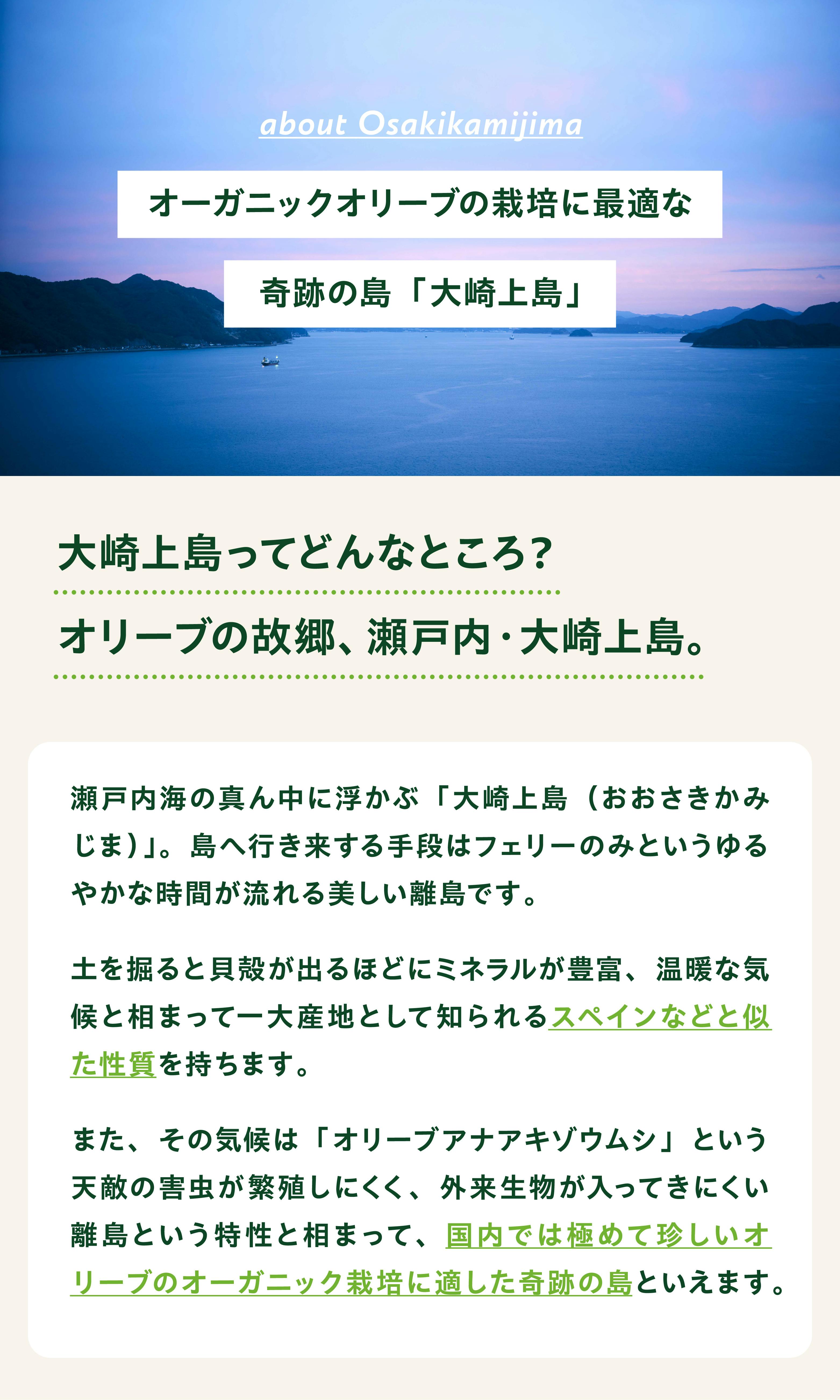 “OLIBIO”誕生の地「大崎上島」や、製品に込めた想いをご紹介いたします。