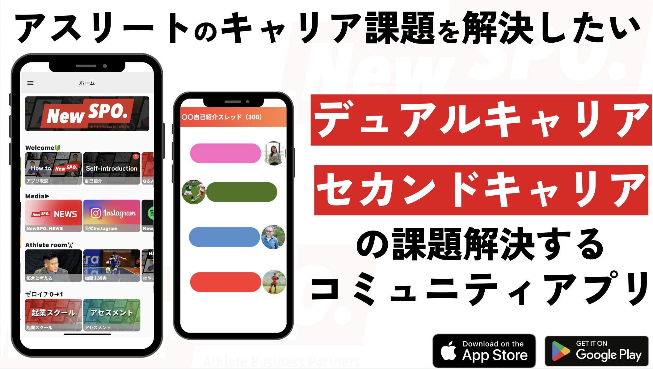 NewSPO.はスポーツの価値を広げ、人々の暮らしを豊かにすることを目指し活動しています。その中で、スポーツに人生を捧げたアスリートのキャリア課題について向き合いました。現役中のアスリートが競技に専念できて、引退後に不安を感じない。そんな世界を目指してコミュニティアプリを作ります。
