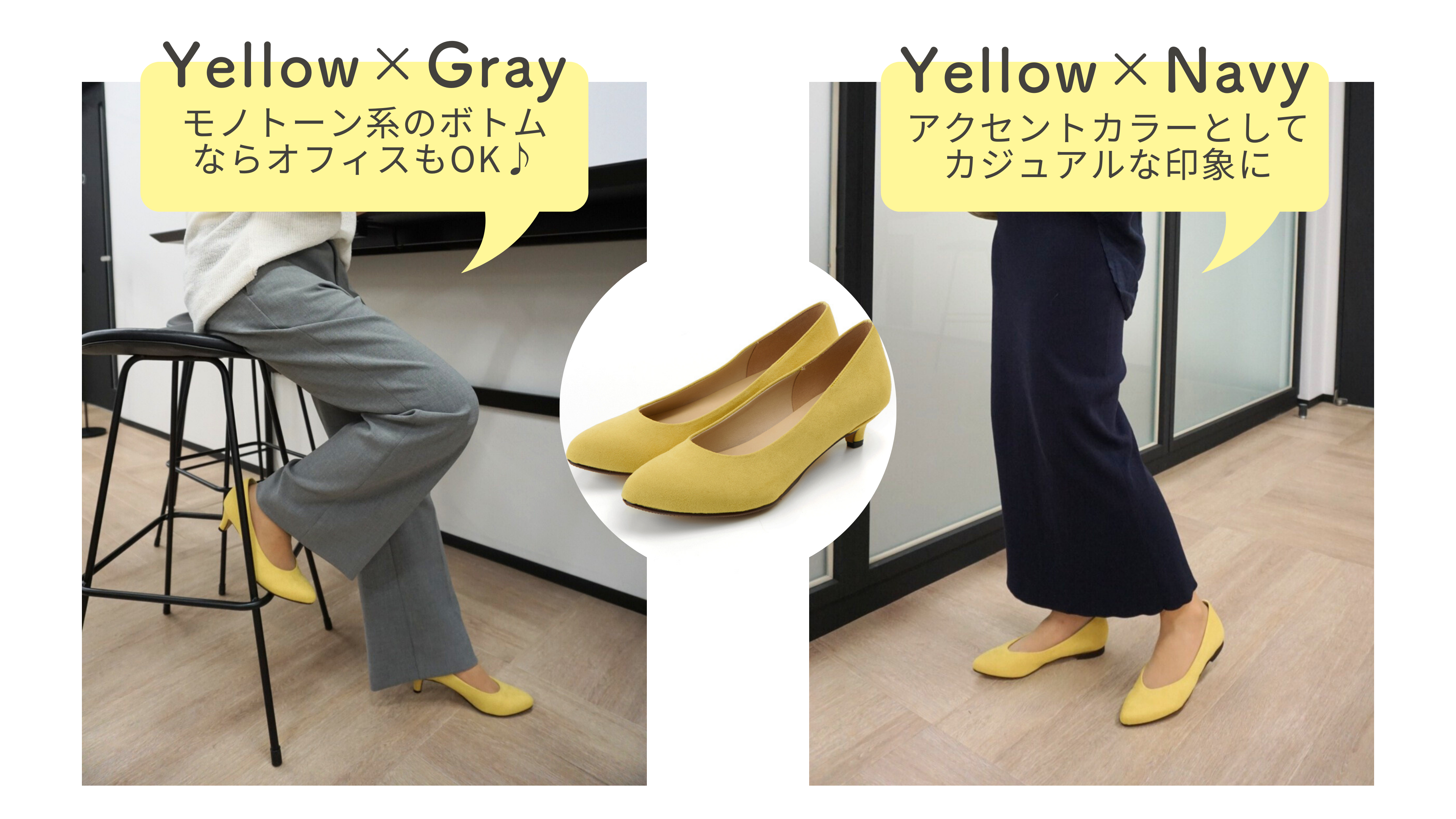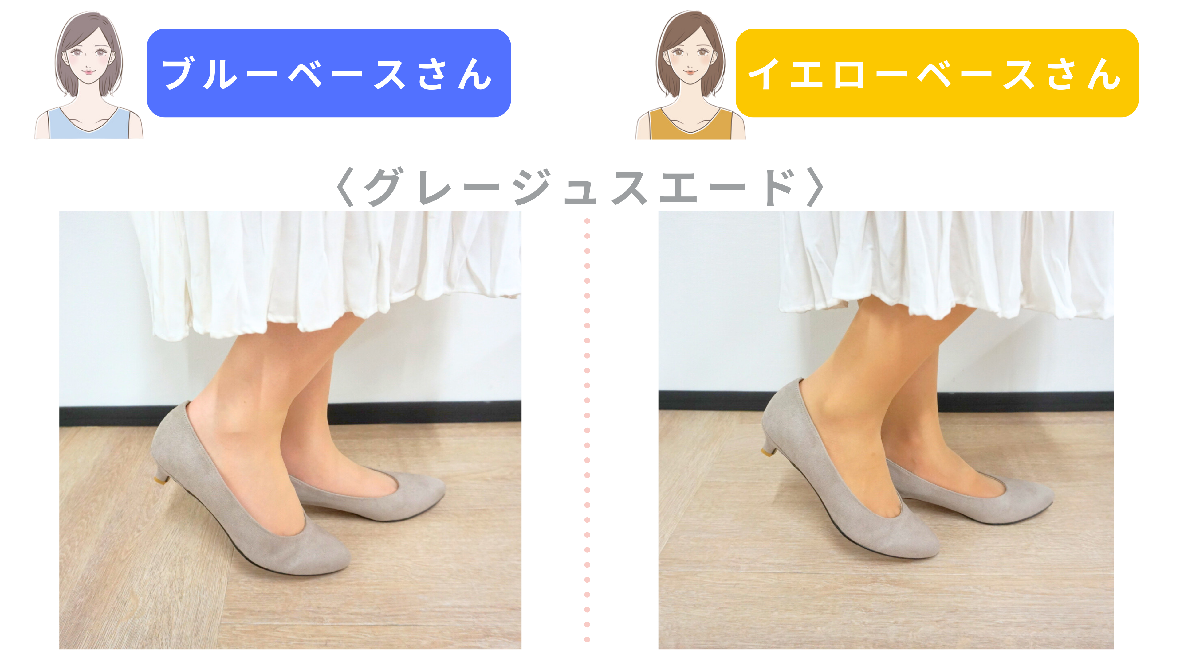 足元にどのように馴染むのか、実際にパーソナルカラーの”イエローベースさん”と”ブルーベースさん”のスタッフで履き比べてみました。