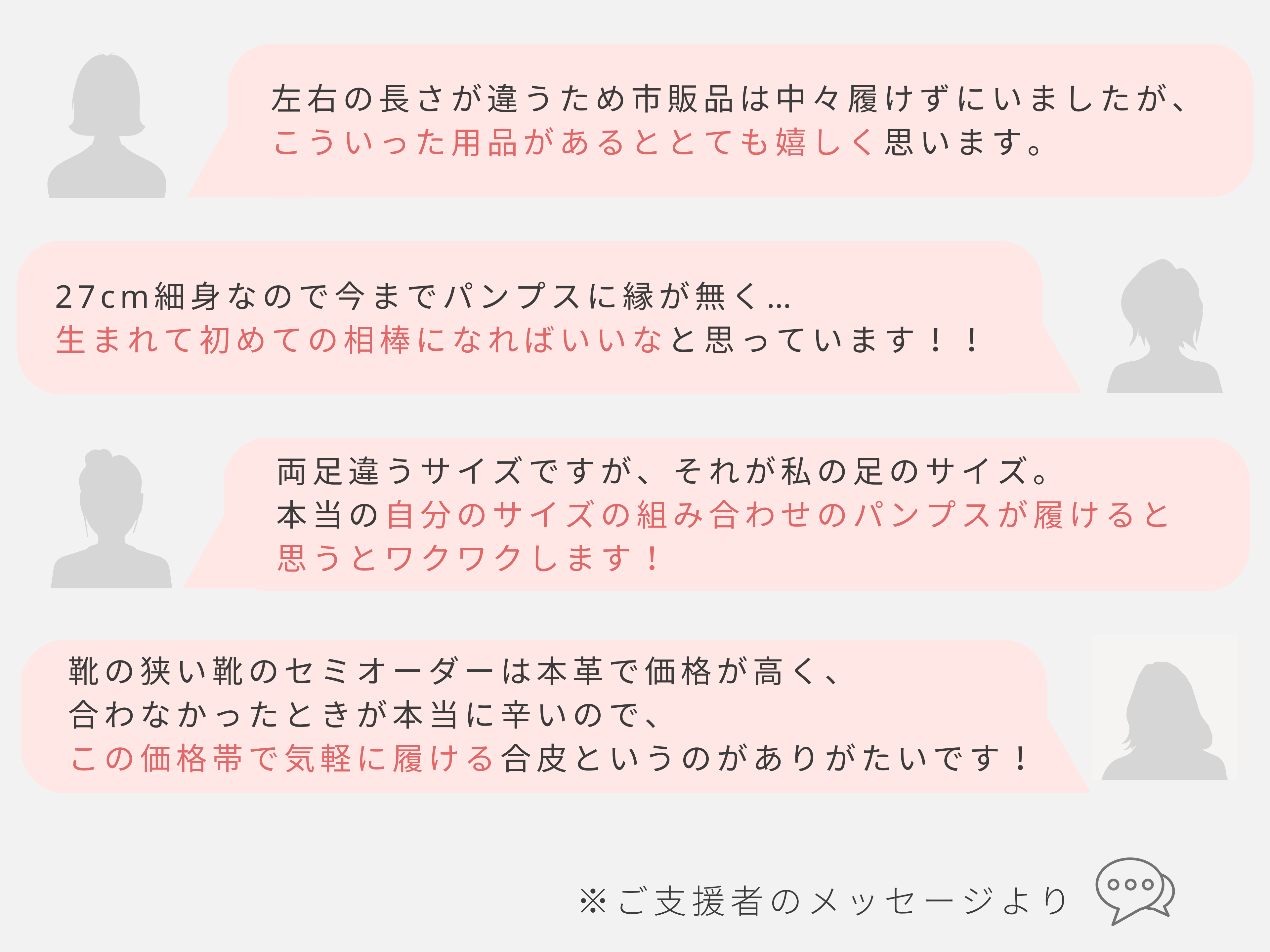 2023/10/03 12:44こんにちは、An idealです。クラウドファンディング第4弾が終了しました。おかげさまで94人の方にご支援いただき、また、あたたかい応援のコメントもいただきまして、感謝の気持ちでいっぱいです。 本当にありがとうございました!パンプスは順次制作しております。左右サイズ違いの方や、2足以上のリターンのご支援の方にはサイズアンケートをメッセージでお送りしております。もしサイズを回答した心当たりがない方は、メッセージにてお問い合わせくださいませ。発送準備が整いましたら改めてご連絡いたしますので、それまで楽しみにお待ちいただけますと幸いです。 もっと見る