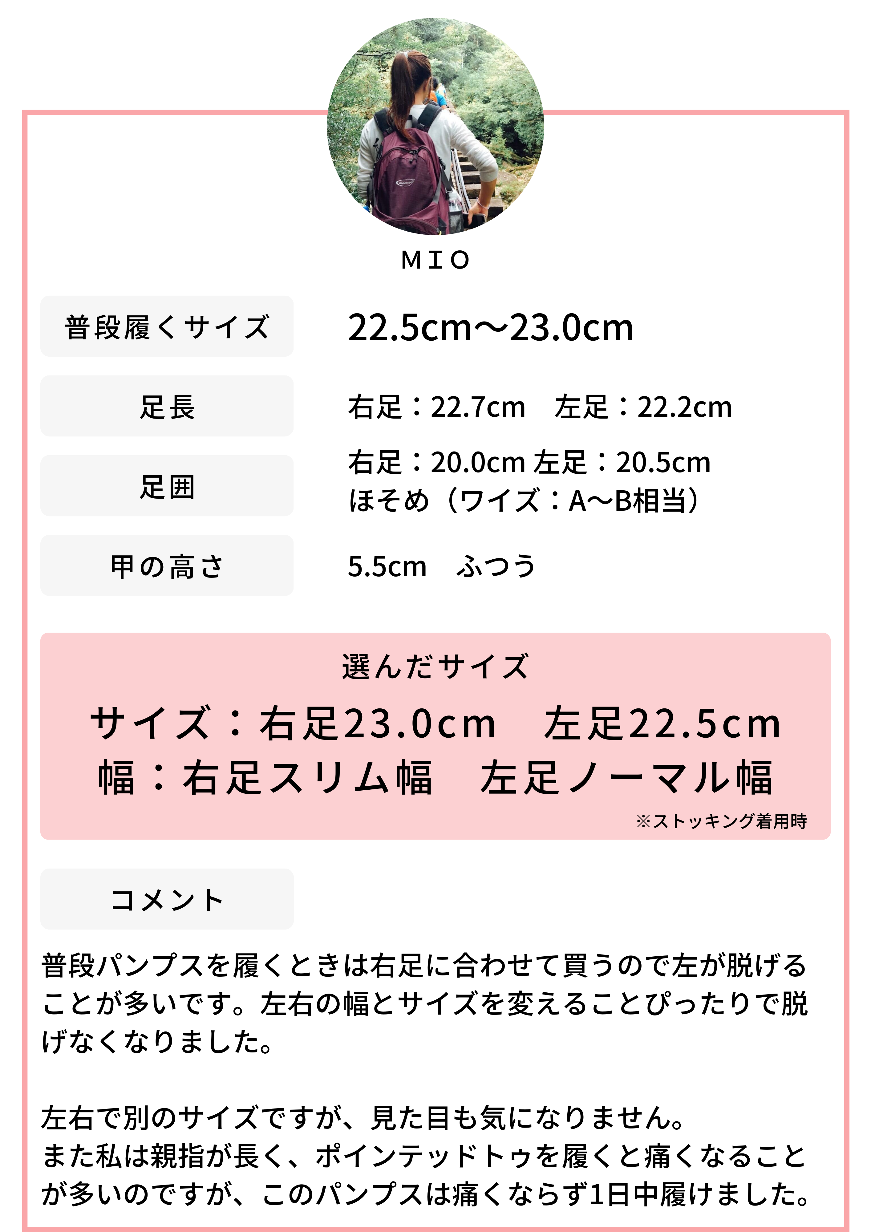 右足と左足でそれぞれ足長サイズ・幅まで選べるので、今までどちらかの足が痛い・片足だけ中敷き入れてカバーしていた、などのストレスから解放されます。
