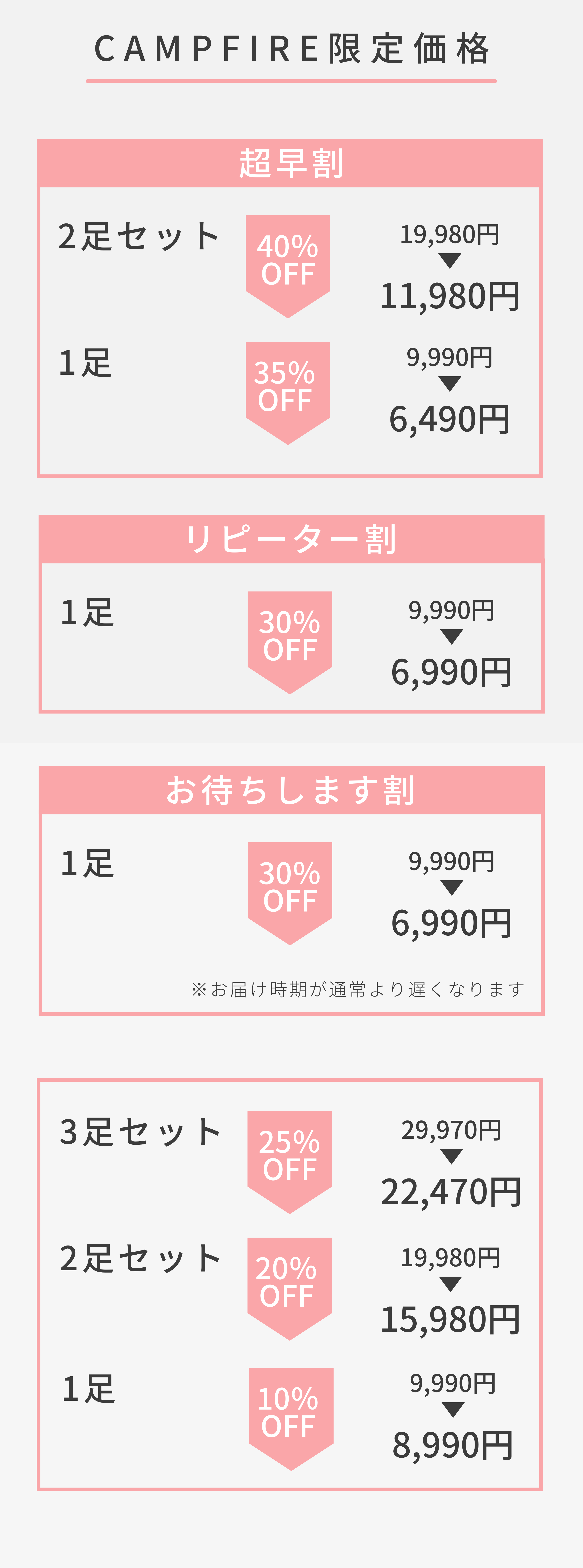 ※2足以上または左右サイズ違いをご支援いただいた方には、お申し込み後、ご希望のカラー・サイズ・幅などについて別途伺いますので、こちらよりメールにて連絡差し上げます。