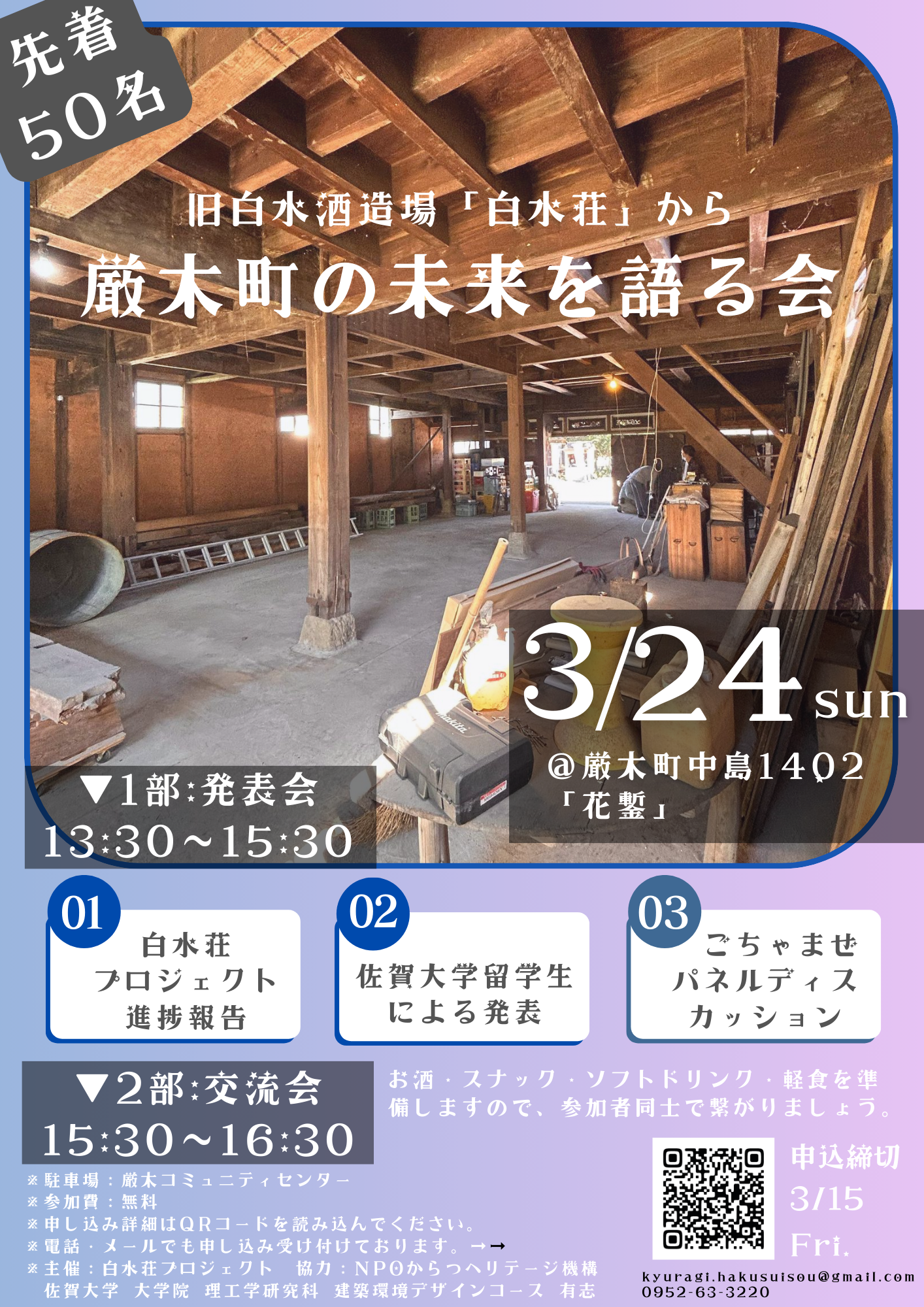 こんにちは!「白水荘プロジェクト」です^^昨日、お伝えしました通り、イベントの告知をさせていただきます。来たる3月24日(日)唐津市厳木町にて、『旧白水酒造場「白水荘」から厳木町の未来を語る会』を計画いたしました。▼イベント詳細(申し込みページ)約1分https://docs.google.com/forms/d/1yUn96xhF59nXoYwPGDi0xOk49SZqcjkoIaU4sPXyxxo/editやっと業者との調整が大詰めとなり、4月より瓦屋根修繕工事を始める予定ですので、現在の姿(外観・瓦屋根)を見る最後のチャンスかもしれません!(できれば、会場参加で実物を見ていただきたいのですが、遠方でかなわない方・オンラインで参加希望の方はその旨お知らせください。オンライン開催を検討したいと思います。)今回は、2部構成のイベントとなります。▼1部 13:30~15:30 語る会①「白水荘プロジェクト」進捗報告②協力いただいております佐賀大学理工学部後藤研究室有志による酒蔵の内装デザイン発表会③今後酒蔵を活用するアイデアを参加者とともに考えるコーナーと盛りだくさんの内容となっております。▼2部 15:30~16:30 交流会お酒・スナック・ソフトドリンク・軽食を準備しますので、参加者同士で繋がりましょう。締切は、3月15日(金)までですが、先着50名となりますので、参加希望の方はお早めに申し込みをお願いいたしますm(__)mみなさまからのお申込みお待ちしております!▼イベント詳細(申し込みページ)約1分https://docs.google.com/forms/d/1yUn96xhF59nXoYwPGDi0xOk49SZqcjkoIaU4sPXyxxo/edit