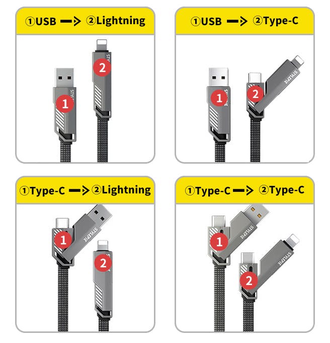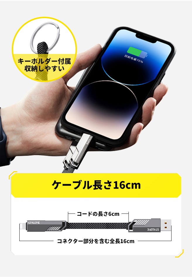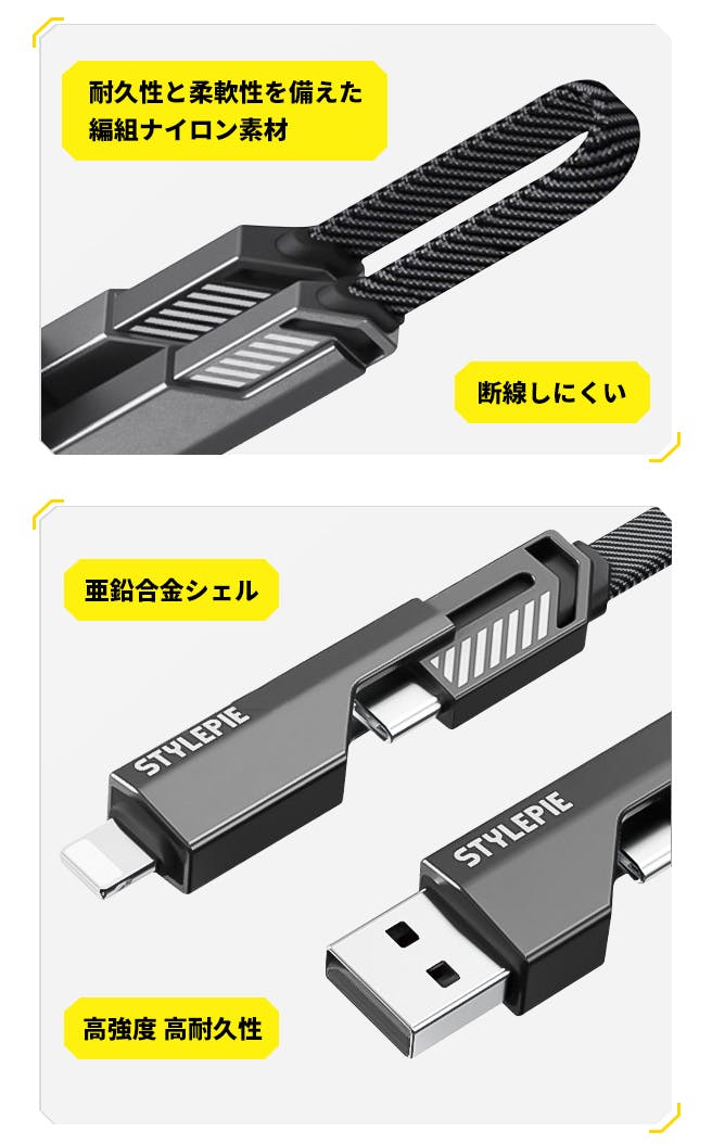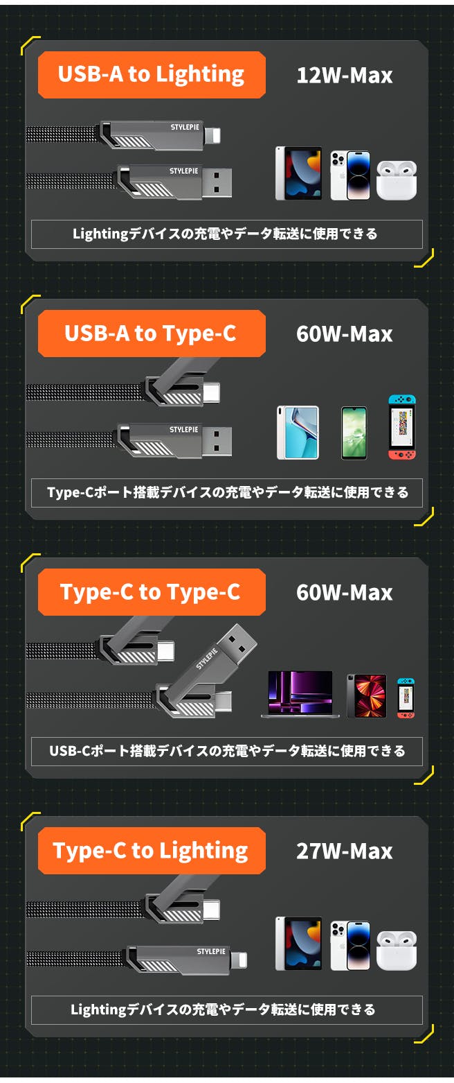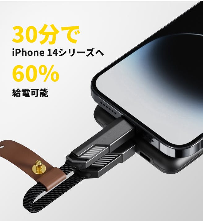 これ1本で4種類のケーブルを兼ねているので、他のケーブルを携帯する必要がありません!いつでもどこでもデバイスを充電できるので、旅行や出張などに最適です。