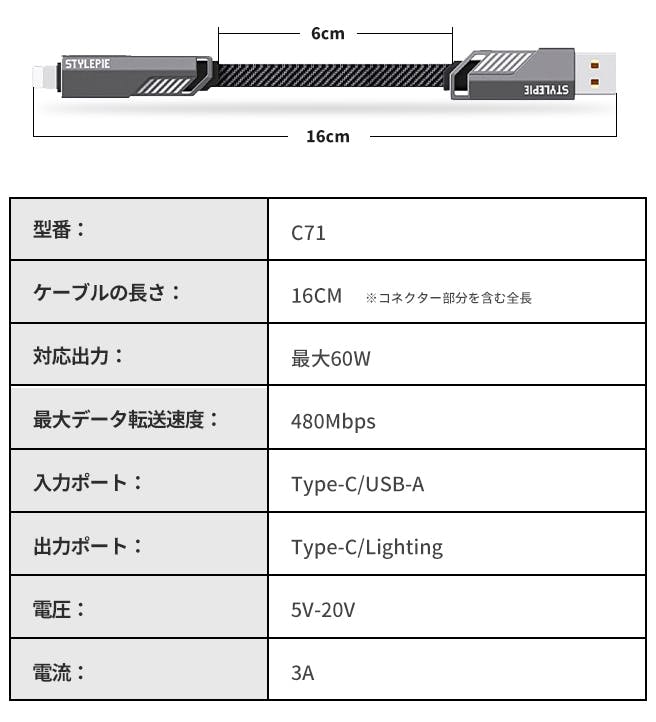 「C71」はUSB-AコネクタとLightningコネクタをどちらもType-Cコネクタに変換できる4-in-1のUSBケーブルです。さまざまな機器の充電、データ転送に使用することが可能です!