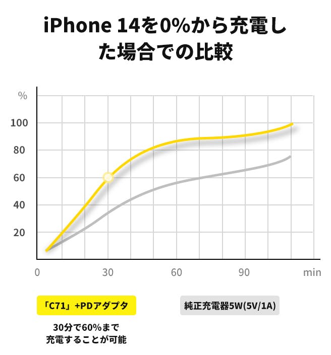 「C71」は通常の充電ケーブルより最⼤3倍の急速充電が可能。充電時間を大幅に短縮できます。
