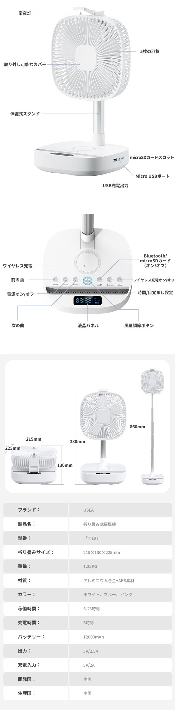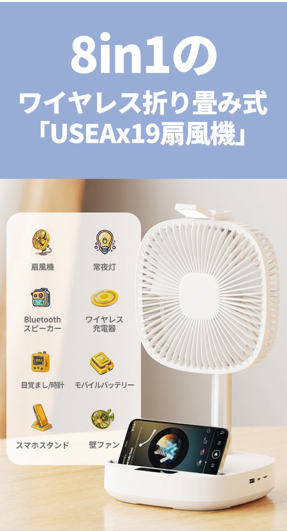 「USEAx19」は、コンパクトな上に、Bluetoothスピーカー、常夜灯、ワイヤレス充電、目覚まし時計などの便利な機能が付属しています。