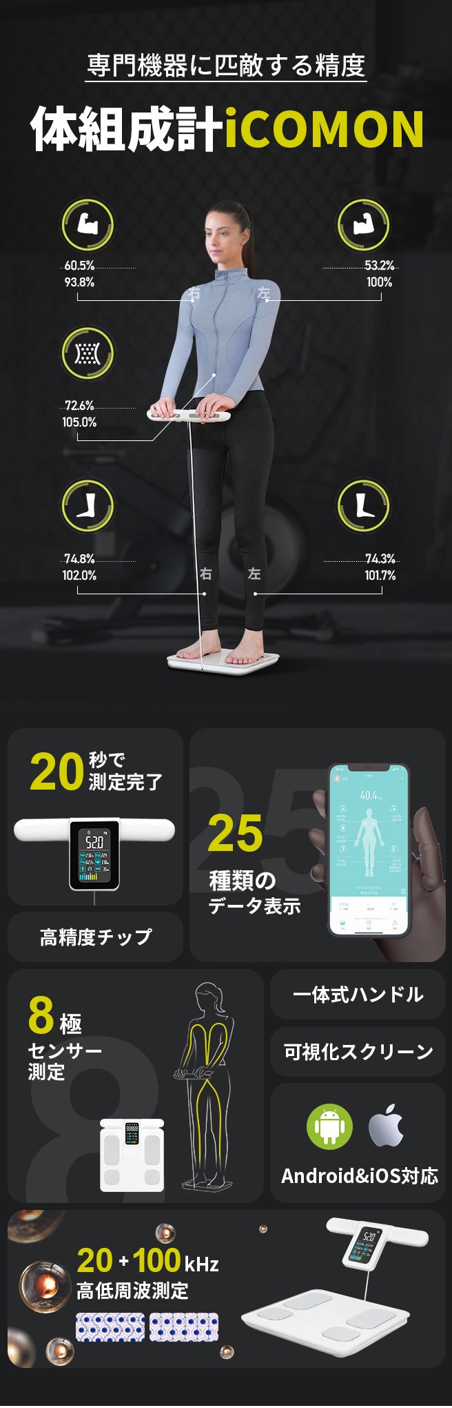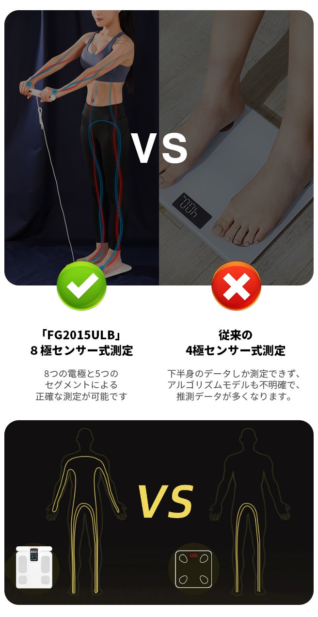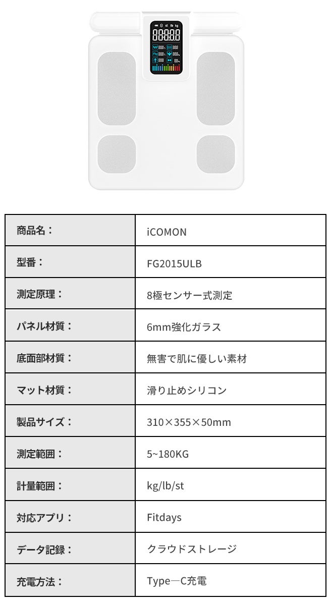 iCOMON体組成計「FG2015ULB」は、8つの電極と5つのセグメントによる正確な脂肪測定を実現しています。両足、両手、胴体全体のインピーダンス測定を行い、独自のデータモデルを使用して、詳細かつ正確な身体組成分析データを提供します。
