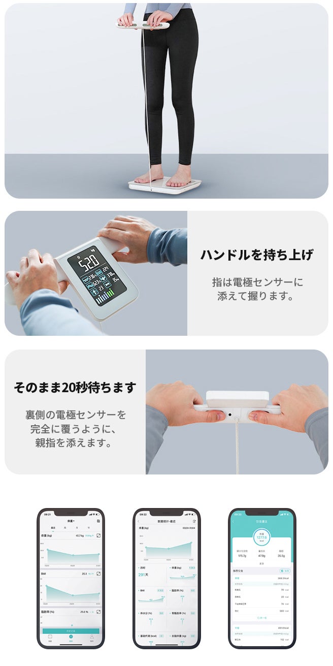 体組成計「FG2015ULB」に乗り、ハンドルを持ち上げ、約20秒後…