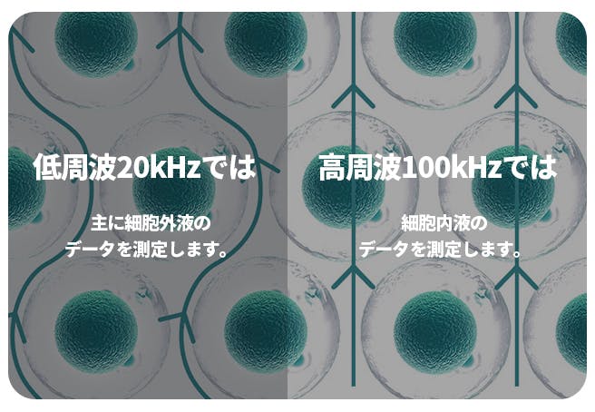 医療業界の主流な測定方法である高低周波のデュアル周波数測定を利用して、細胞膜を通過する電流の能力を向上させ、細胞内液のインピーダンス値を測定します。これにより効果的に精度を高めることができ、全身の成分データを取得します。