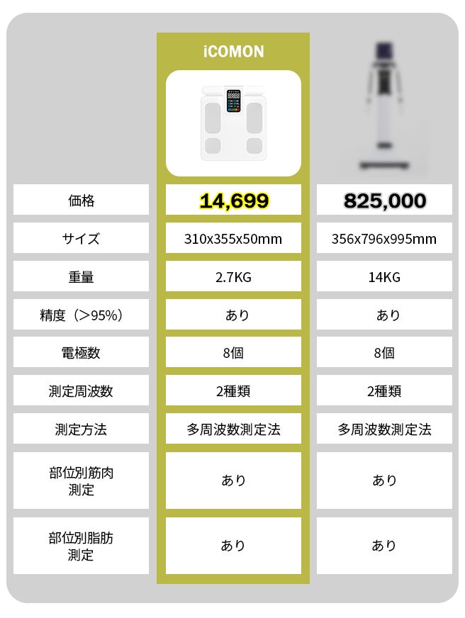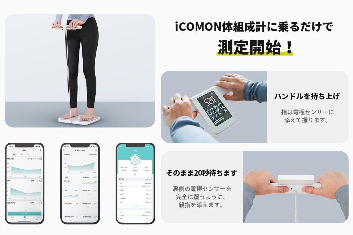 iCOMON体組成計「FG2015ULB」は、8つの電極と5つのセグメントによる正確な脂肪測定を実現しています。両足、両手、胴体全体のインピーダンス測定を行い、独自のデータモデルを使用して、詳細かつ正確な身体組成分析データを提供します。