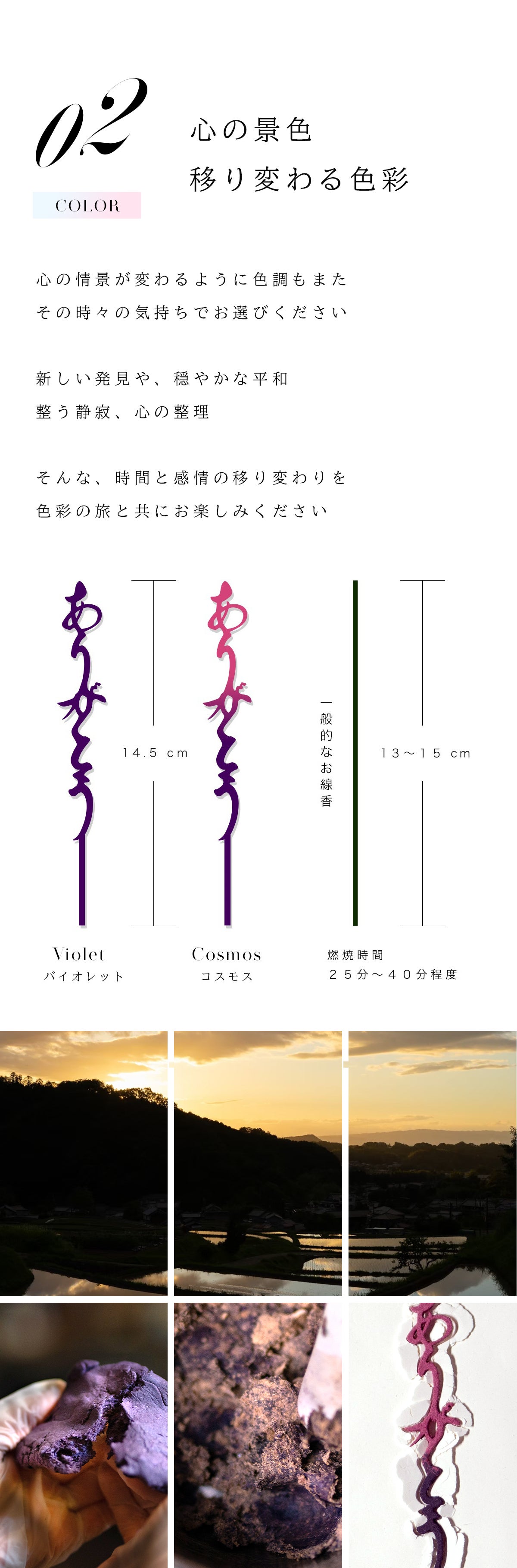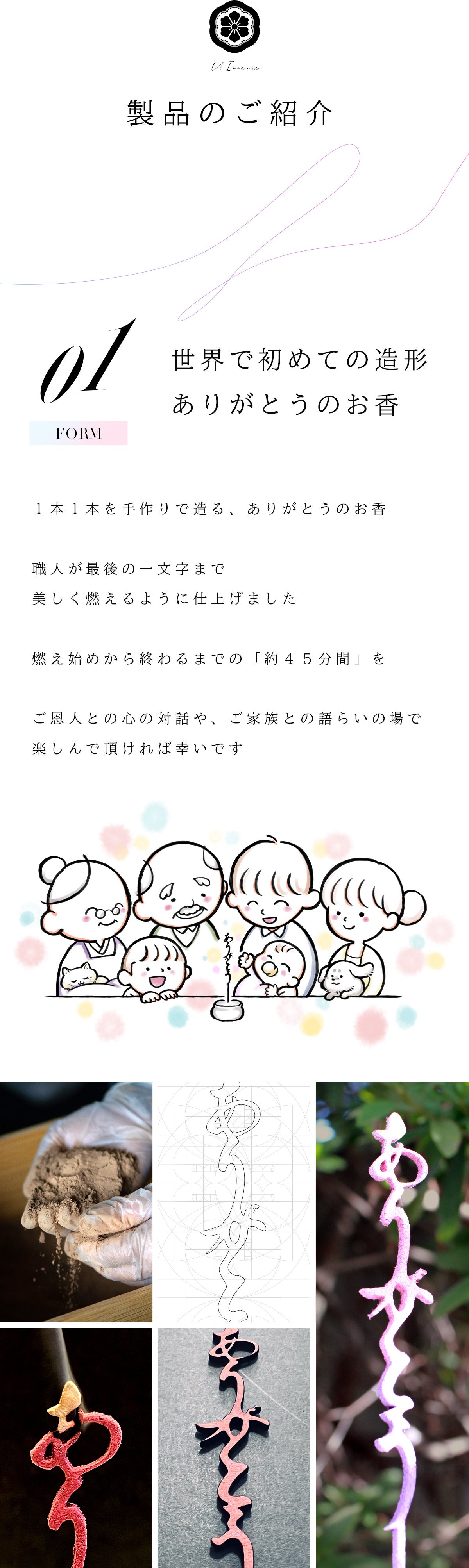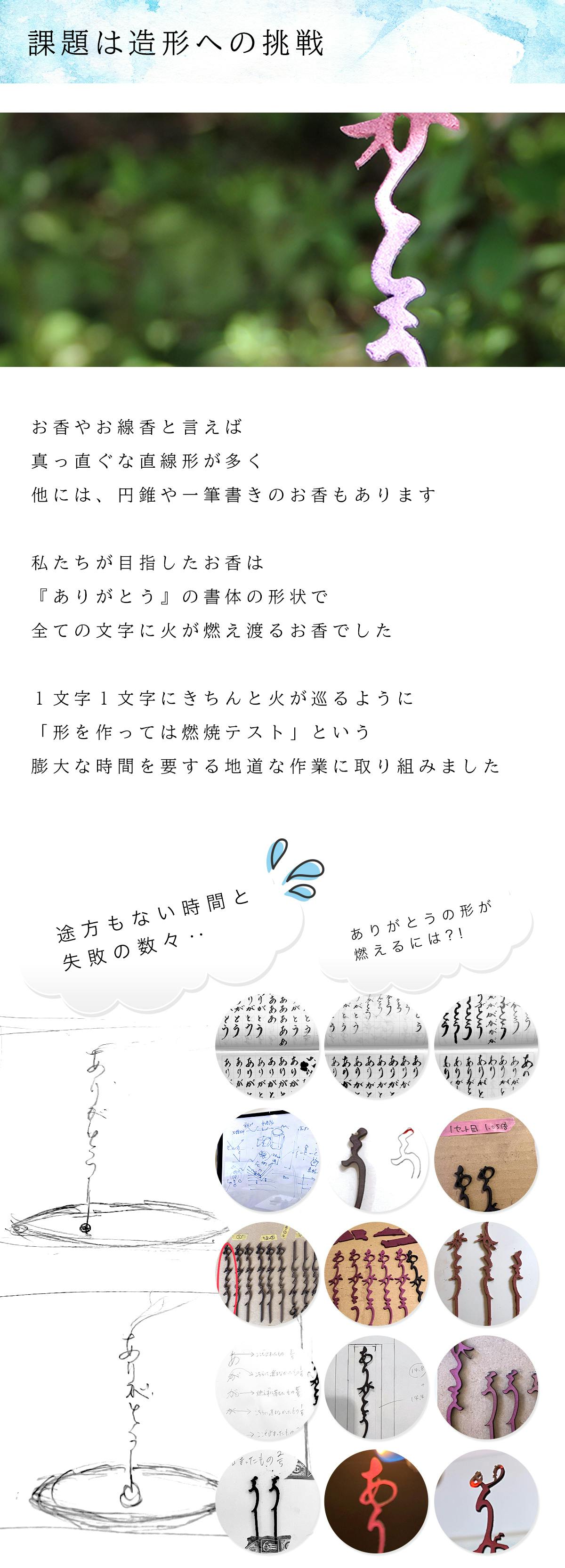 一番の違いは形状です。今まで当たり前であった直線棒状のお線香とは違ったデザインを施すことで、お香を炊く時間が故人様を偲ばれる大切なお時間となることと願っております。