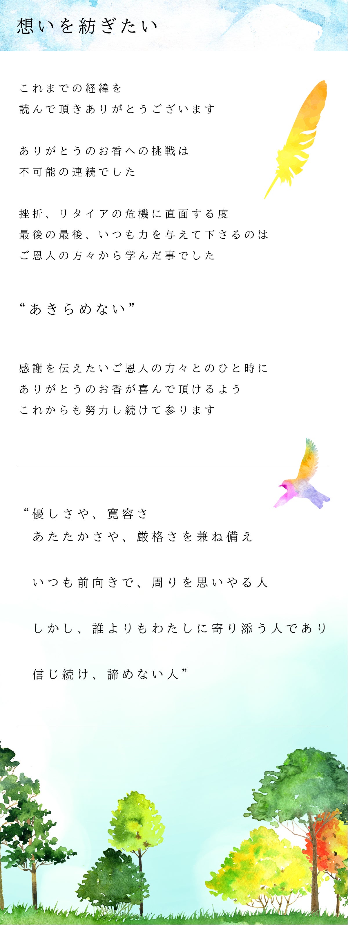2024/02/18 21:40ついに『ありがとうのお香』プロジェクトもご支援締め切りまであと1日となりました!初日、あっという間に目標金額を達成し呆然としたのが昨日のことのような、ずっと前の出来事のような不思議な感覚です。 これまでご支援くださった皆さま、ご協力くださった皆さま、心から感謝しております。初めてプロジェクトページをご覧くださる方も、ぜひ手に取っていただきたくご支援いただければと思います!大切な方、親しい方へありがとうをお伝えできる『ありがとうのお香』贈り物としてもぜひ^^まだまだ最後の最後まで頑張りますので、応援どうぞよろしくお願いいたします!【↓↓プロジェクトページ↓↓】https://camp-fire.jp/projects/view/689989 もっと見る
