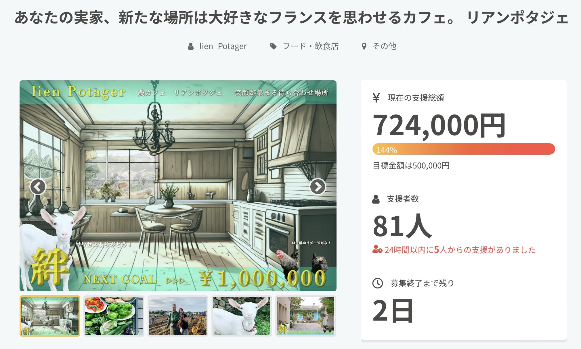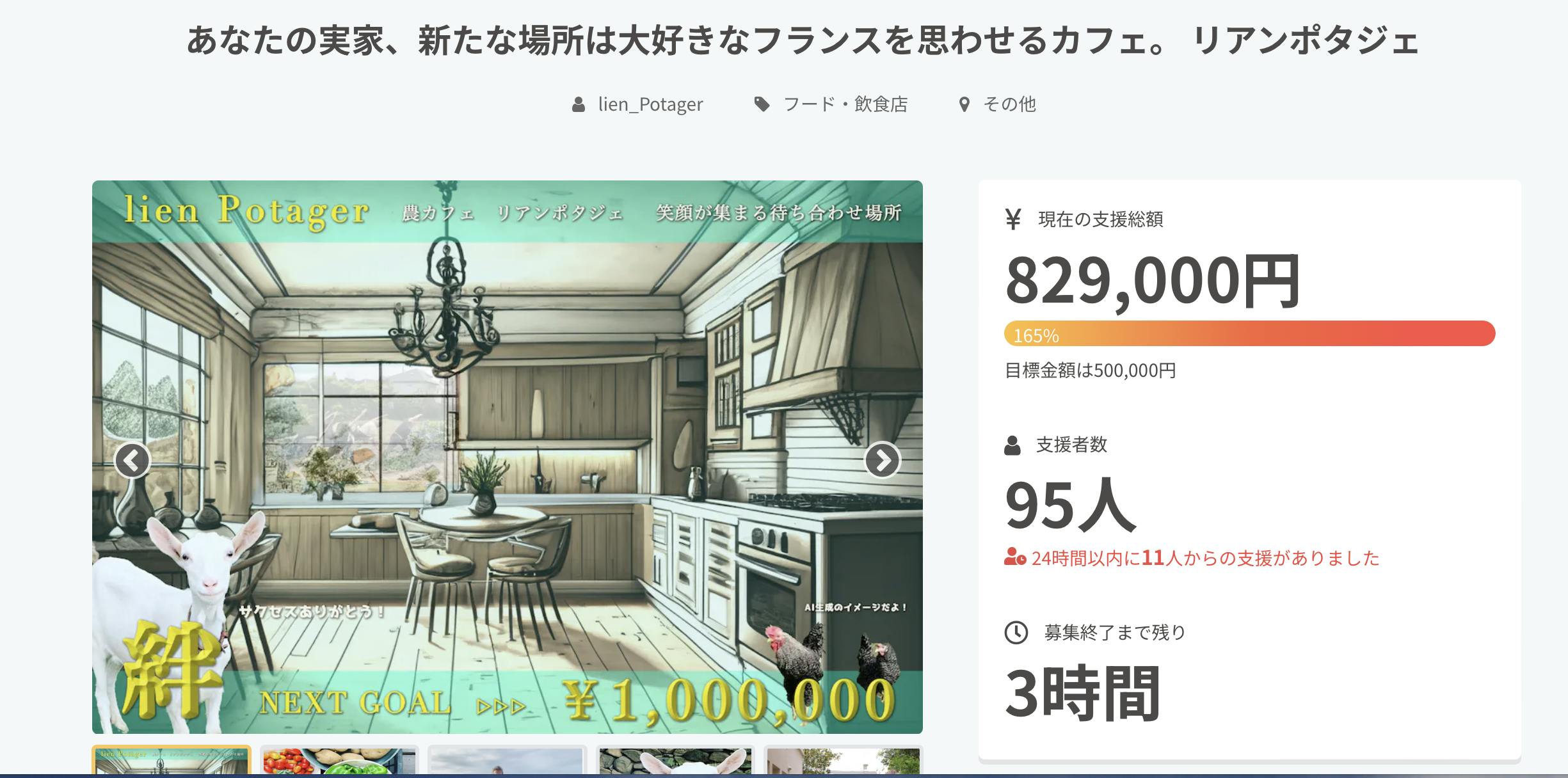 2023/10/31 20:07あと3時間となりました!!皆様、本当にありがとうございます。この3日間で多くの方にご支援いただきました。この1ヶ月、色々な思いを感じることができて支援いただくことがこんなにも嬉しいことかと感じております。本日、23:59までとなります。リアンポタジェのテーブルと椅子が購入できるまでにあと少しです。最後までできることをやり続けます。 改めて、シェア、口コミ、多大なるご支援をいただきましたこと感謝申し上げます。 もっと見る