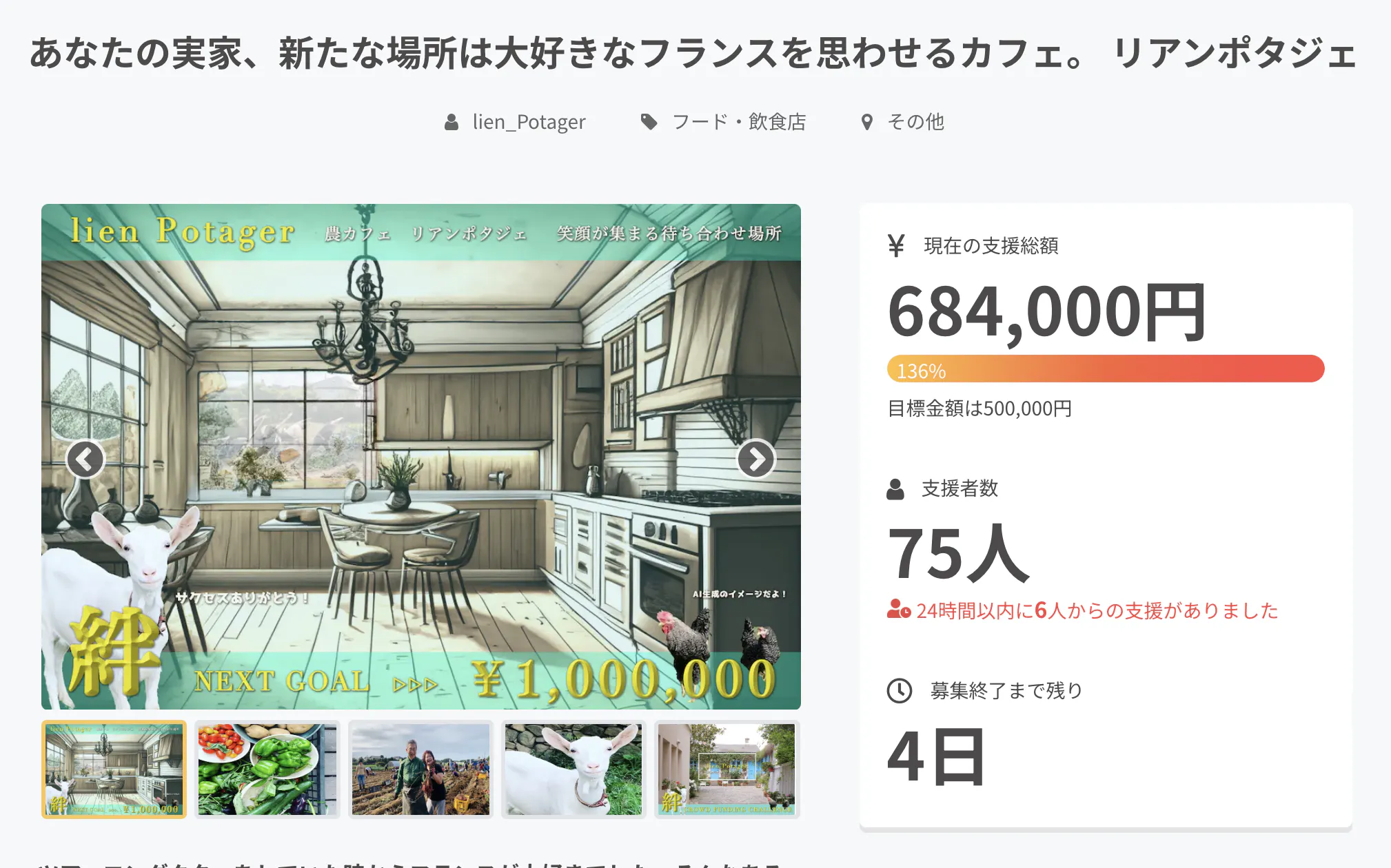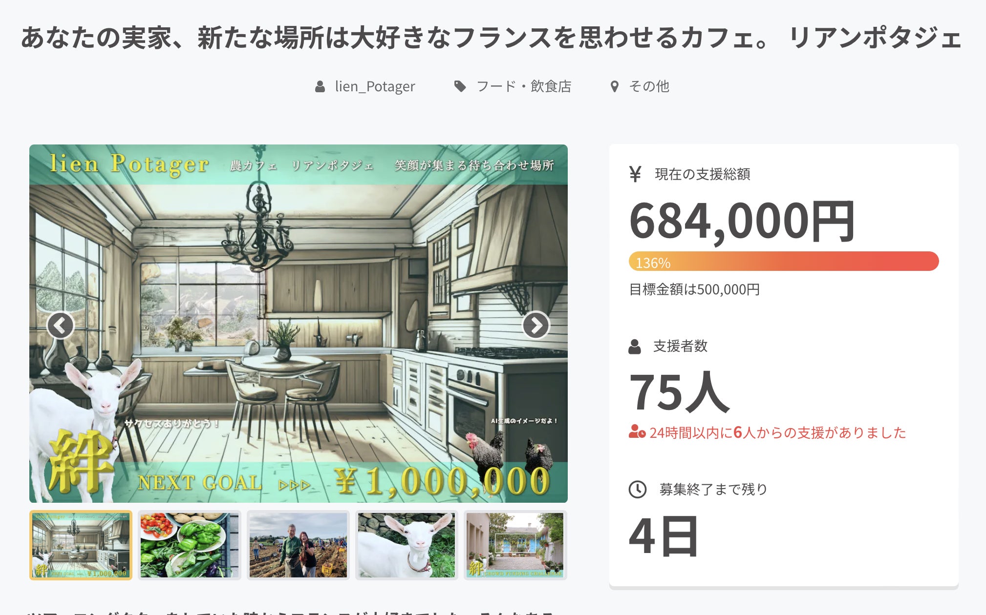 75人もの方に支援をいただき「新しいカフェ楽しみにしてるよ!」「行くからね!」そんなお声もいただき、感謝でいっぱいです。