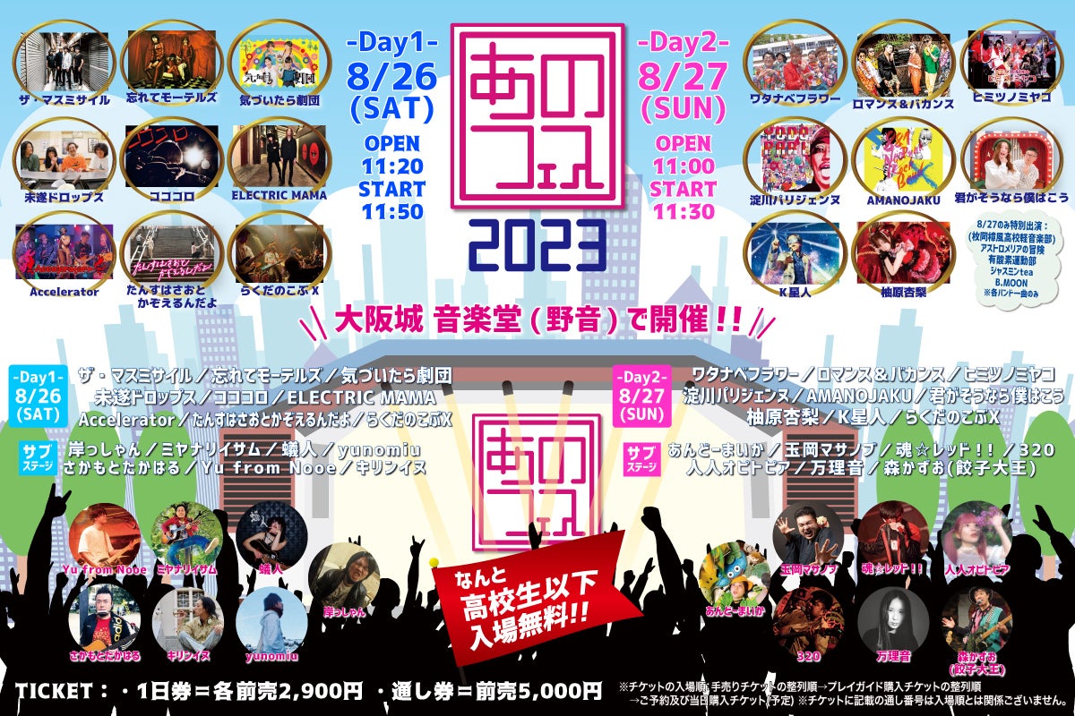 (メインステージ)ワタナベフラワー/ロマンス&バカンス/ヒミツノミヤコ/淀川パリジェンヌ/AMANOJAKU/君がそうなら僕はこう/柚原杏梨/K 星人/らくだのこぶ X/枚岡樟風高校軽音楽部 : アストロメリアの冒険・有酸素運動部・ジャスミンtea・B.MOON
