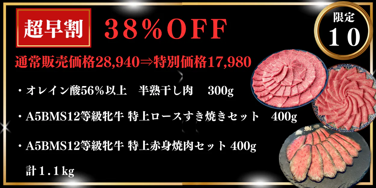 こちらは半熟干し肉に匠の肉で人気の特上ロースすき焼きセットと特上赤身焼肉セットがセットになったリターンです。