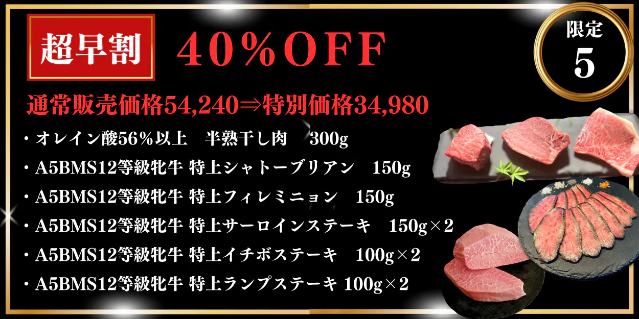 通常オレイン酸56%以上のブランド和牛を使用するところ、10月5日までにご支援いただいたお客様には、”オレイン酸58%以上ブランド和牛”を使用して半熟干し肉を作成いたします。