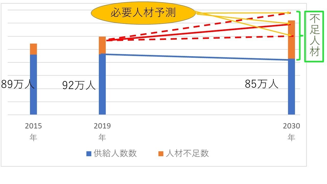 経済産業省が公表した既存統計調査データをもとに推計した『IT人材の供給動向の予測』では、IT人材需要との需給ギャップから、2030年時点で最高約80万人規模でIT人材不足が生じる懸念があることが試算されています。