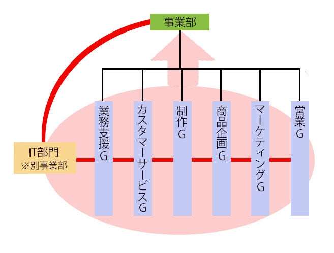 それに、このような「縦割り」のかたちだと、会社全体としてどのような動きをしているか、という「目標に向かう気持ち」が薄くなりがちです。