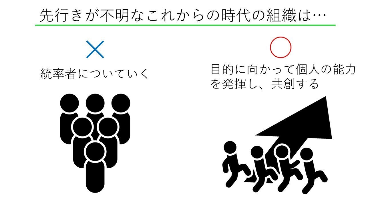 これからの時代に必要な共創力の高いチームにするには、強い統率力を持つ「率いるリーダーシップ」(正解はこっちだ、俺についてこい!!型)ではなく、人々を目的に向かわせる「導くリーダーシップ」(目的に向かうには?おのおの最善を尽くそう型)をベースに、動くことが適しています。