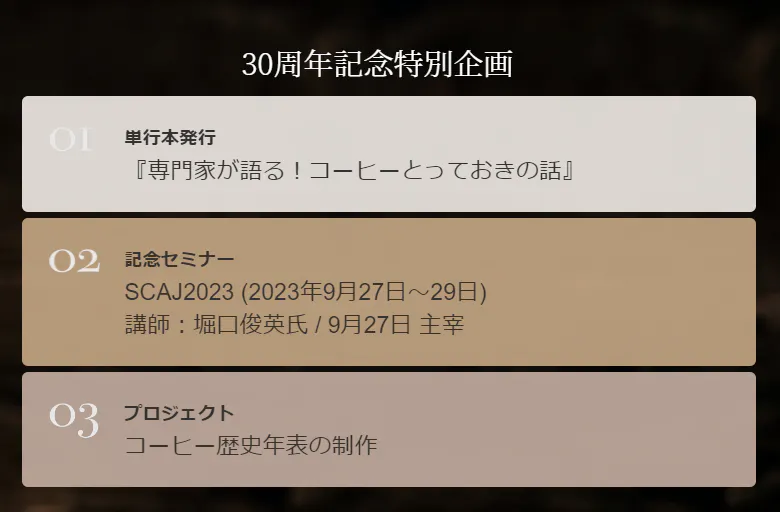 直近では9/27より行われるアジア最大のスペシャリティコーヒーイベント:SCAJ での講演(創立30周年イベントその2)や2024年にはコーヒー歴史年表の制作(創立30周年イベントその3)を予定しています。今回ご支援いただいた方には随時イベント情報をご案内差し上げます。